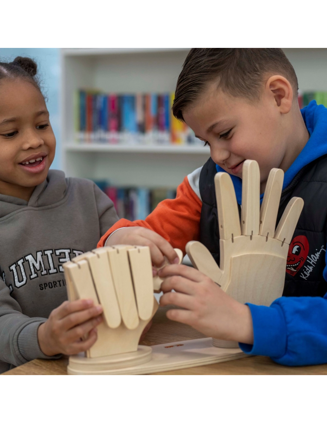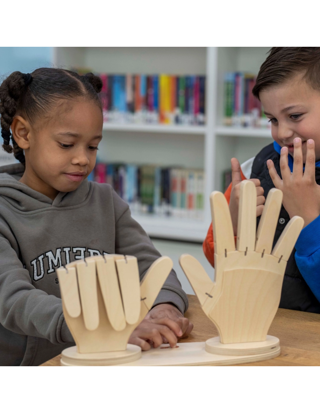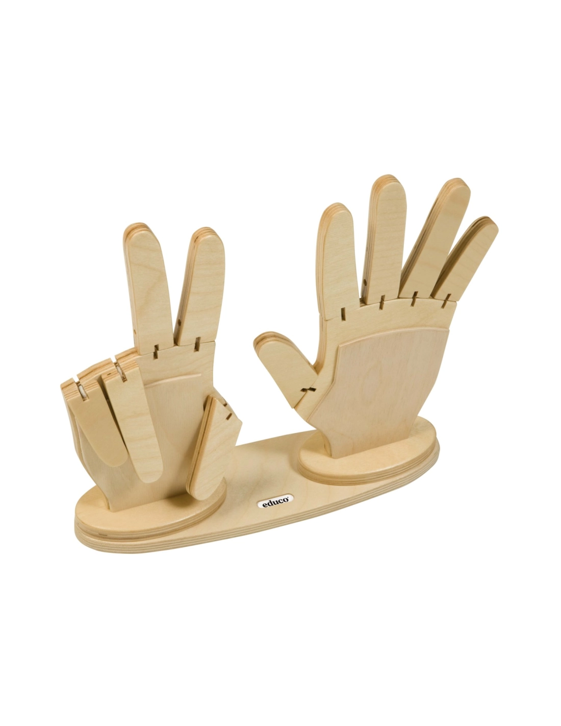 Ces grandes mains articulées en bois permettent une progression entre les doigts et le calcul mental.