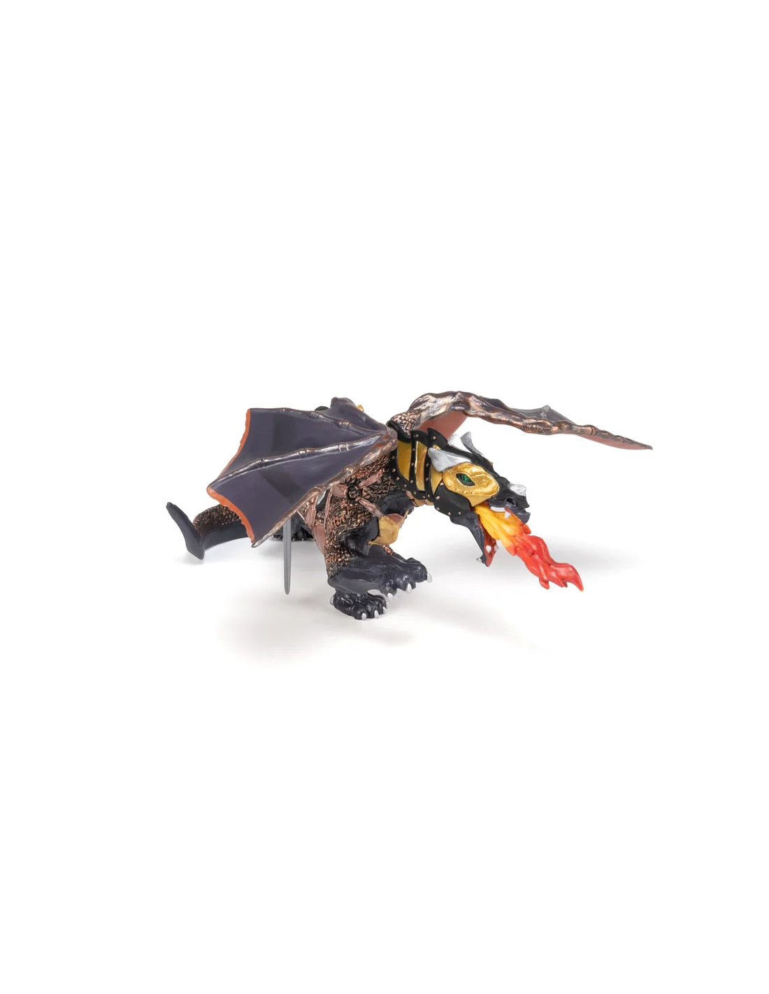 Les écailles du Dragon des ténèbres ne sont pas simplement noires — elles sont brillantes d'un noir profond qui réfléchit la lumière lunaire différemment selon l'angle. Cette finition crée une créature qui, de face, brille sous la lune, mais que de côté ou de loin on distingue à peine du ciel nocturne. Papo a reproduit ce paradoxe visuel avec une précision de peinture rare dans la gamme.
