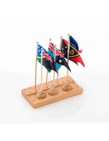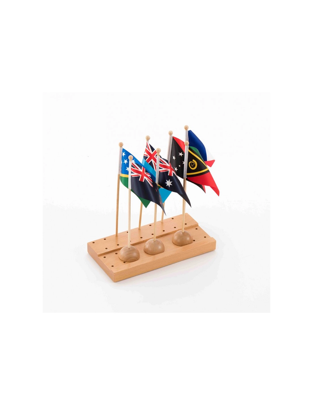 Ensemble complet des drapeaux des 48 pays d'Asie avec support en bois massif, un matériel Montessori de qualité conçu par Nienhuis pour l'éveil à la géographie et aux cultures d'Asie.