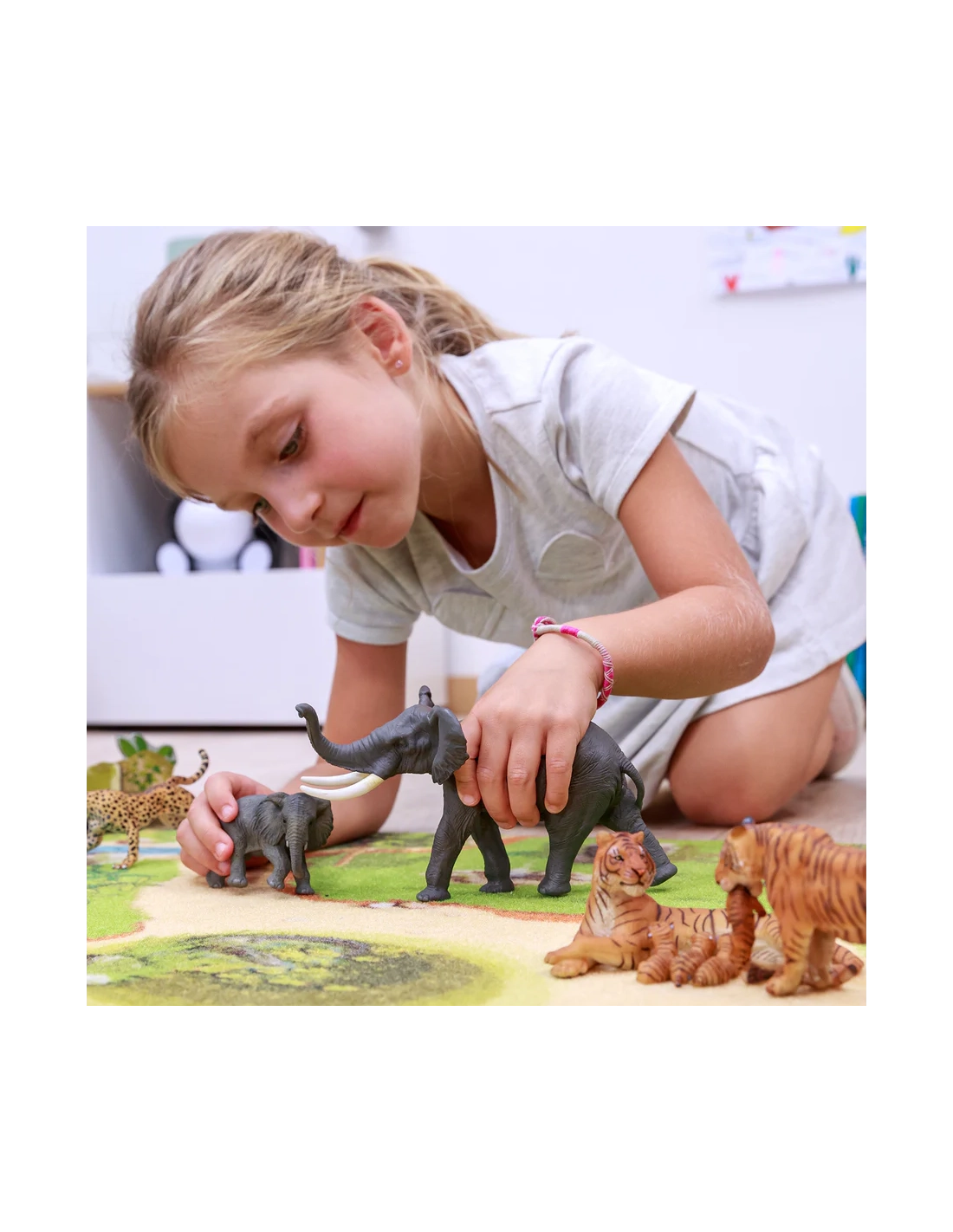 Robuste PVC, sans petites pièces, peint à la main — un jouet qui résiste. La posture de barrissement fascine les jeunes enfants qui la reconnaisent immédiatement dans les documentaires. Point de départ naturel pour des heures de jeu narratif dans la savane.