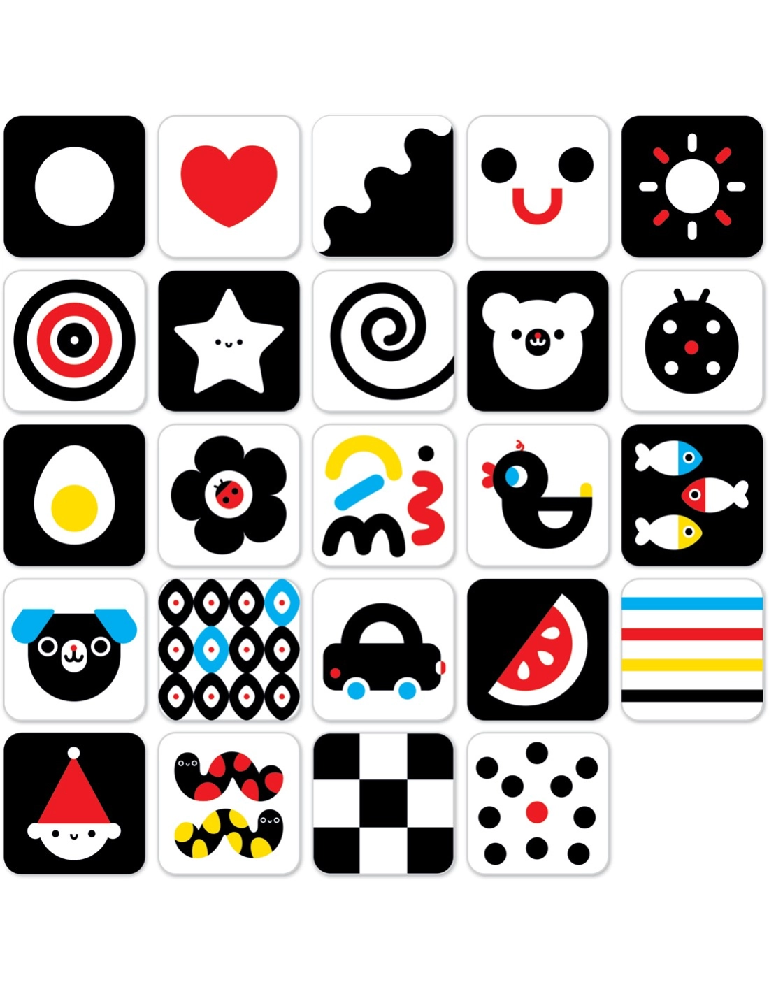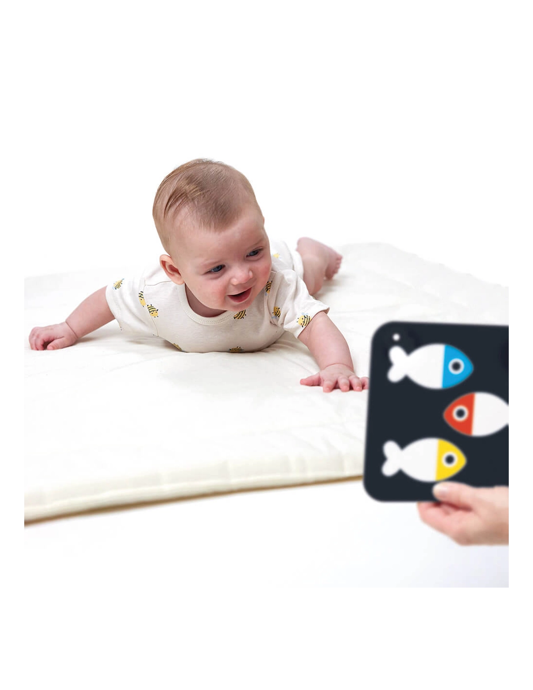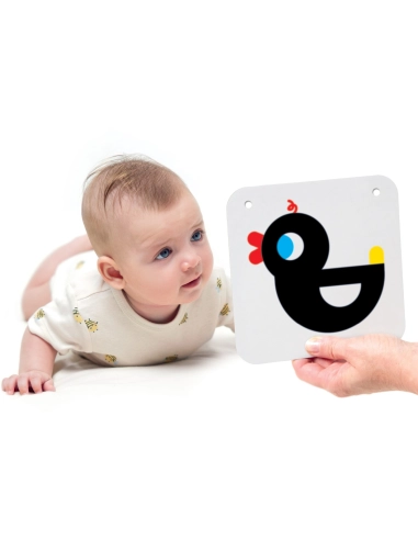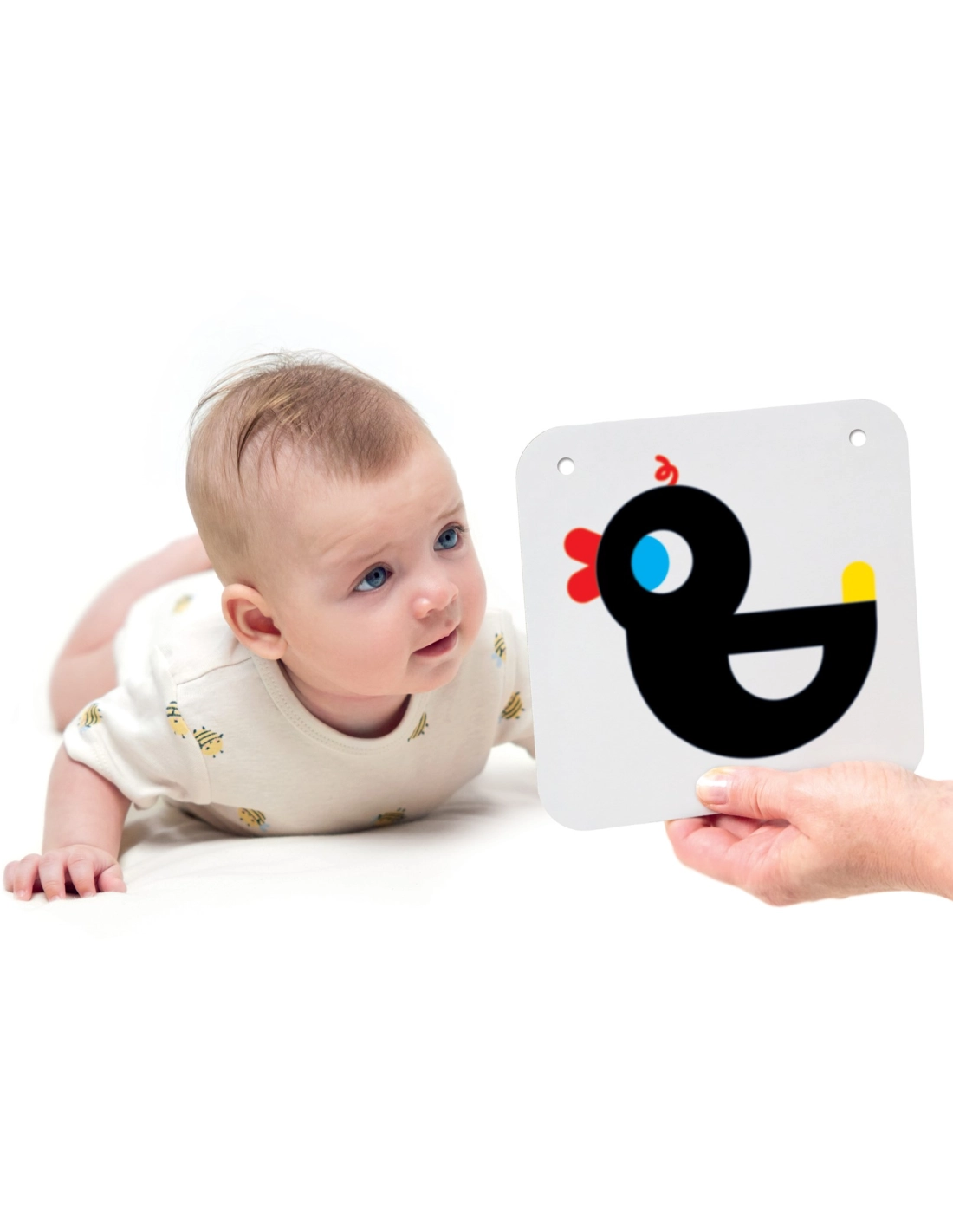 Au début, la vue de votre bébé est encore en développement. Les bébés ont une préférence pour les motifs clairs et contrastés, et leur capacité à distinguer les détails des images et les couleurs se développe progressivement au fil des mois. Nos cartes éducatives sont conçues pour offrir ces contrastes fascinants. Vous pouvez les suspendre près du lit ou de la poussette, ou même créer une guirlande stimulante ! Dans notre guide inclus, vous trouverez également d'intéressantes informations pratiques sur le développement des bébés et de nombreuses idées pour s'amuser ensemble.