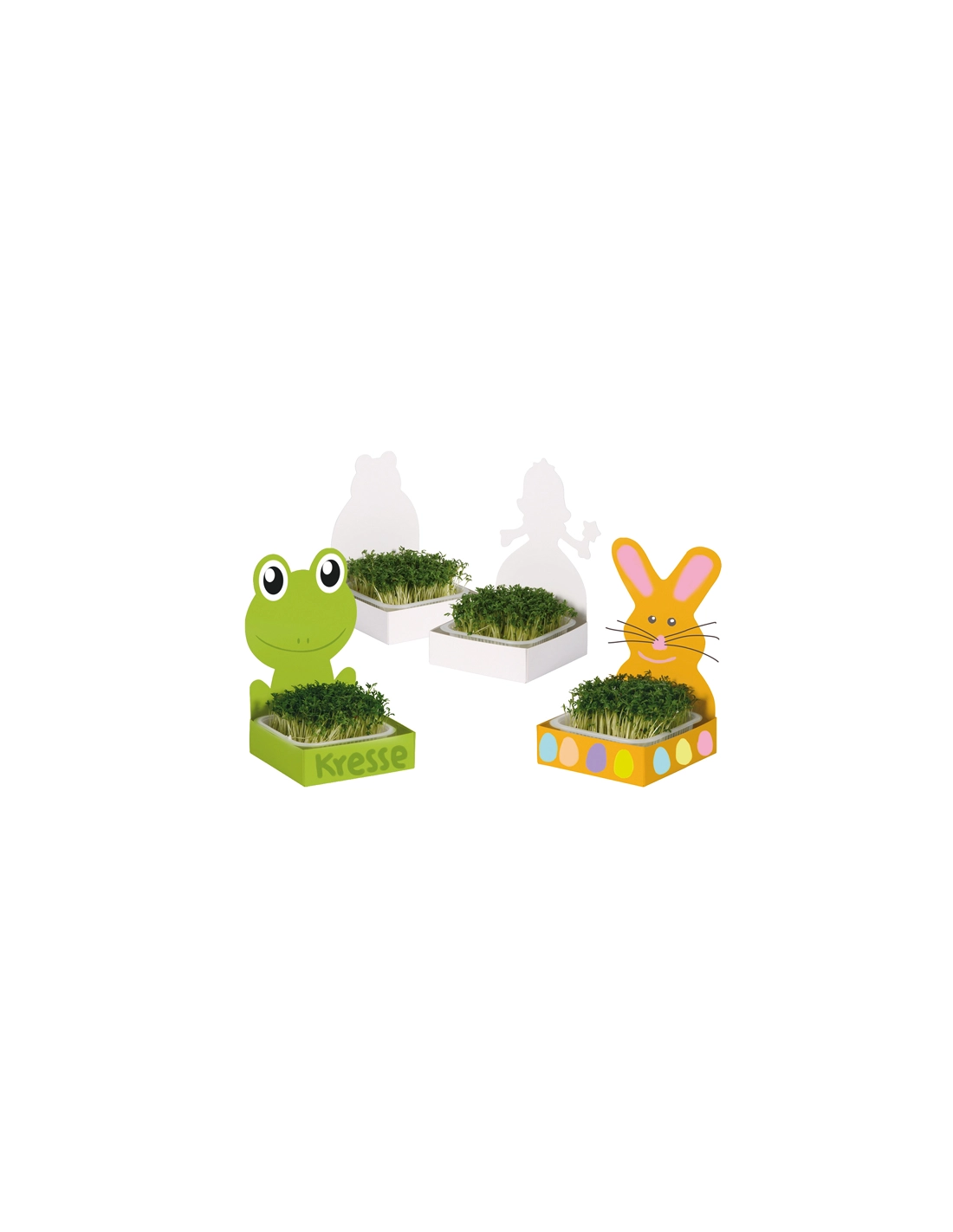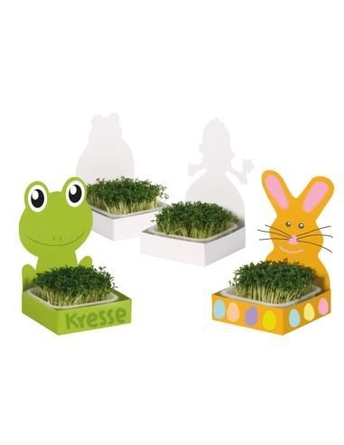 Ils pourront laisser libre cours à leur créativité en peignant les affiches en carton fournies, puis remplir les bols en plastique avec de la terre fine et des graines telles que le persil, la ciboulette, le cresson, le trèfle porte-bonheur, les pâquerettes, etc., et les placer dans le support fourni. En fonction de la variété, les premières pousses apparaissent après seulement quelques jours d'arrosage. Les plantes entièrement développées sont une décoration naturelle (et peut-être comestible) pour le rebord de la fenêtre ou un cadeau magnifique qui vient du cœur.