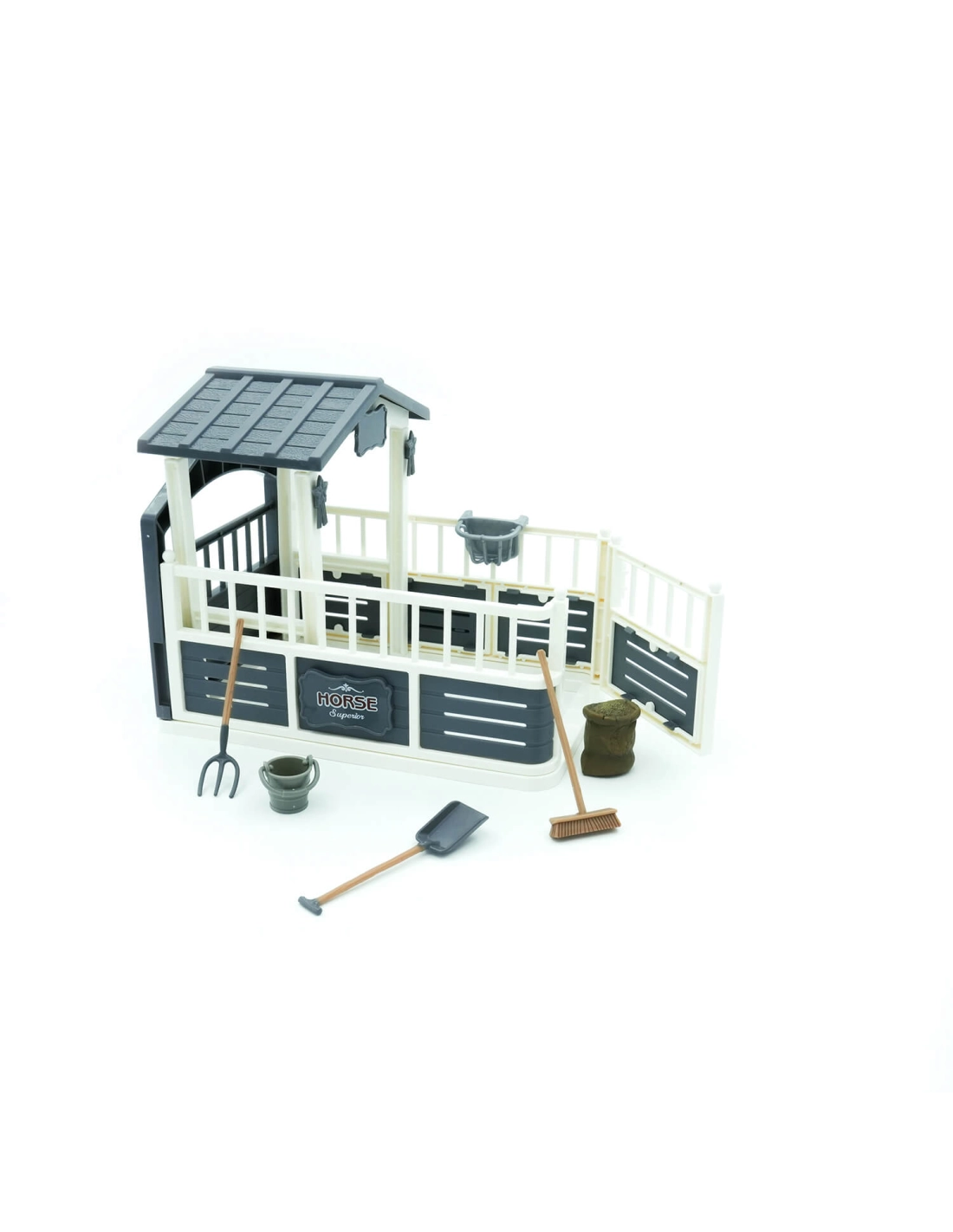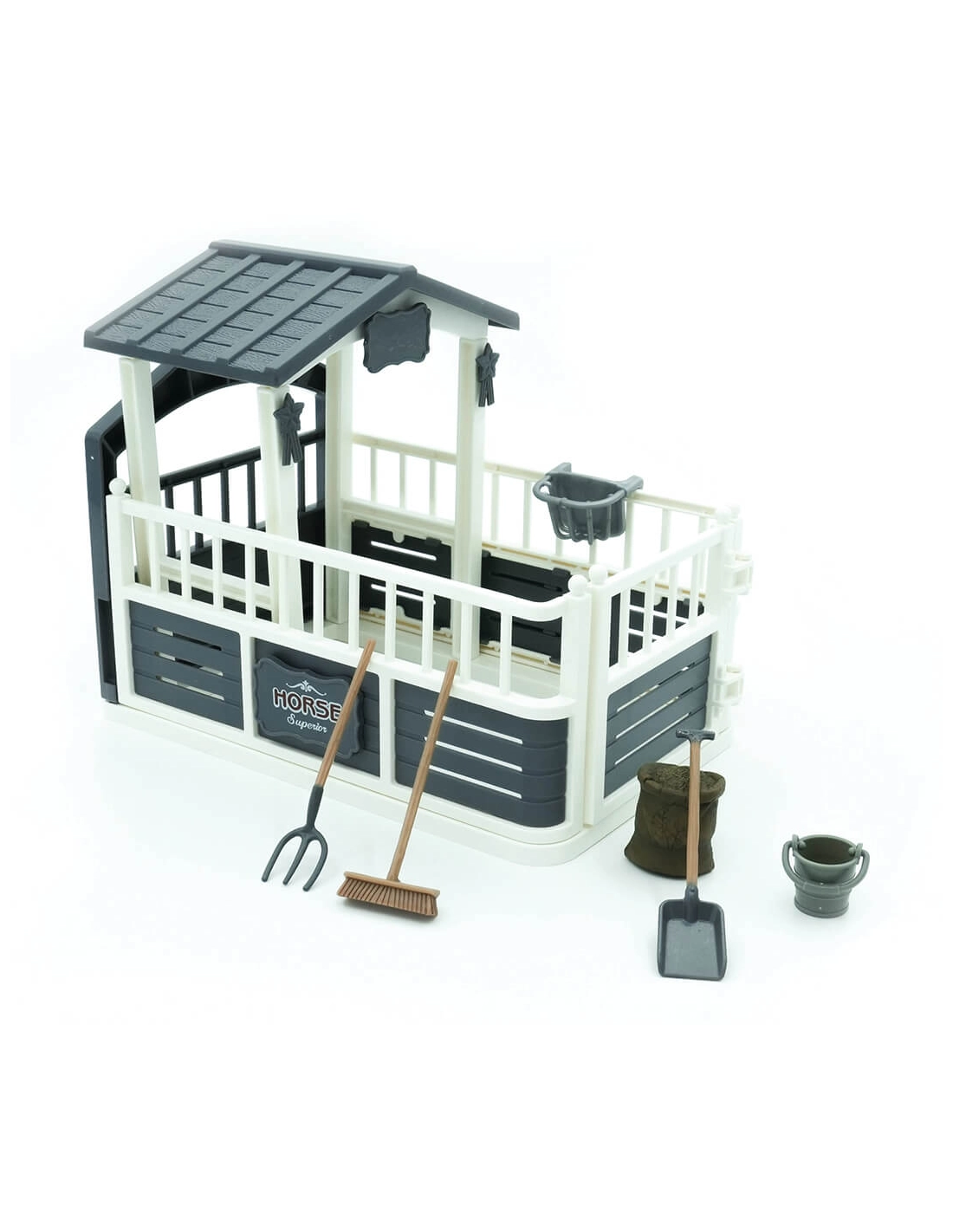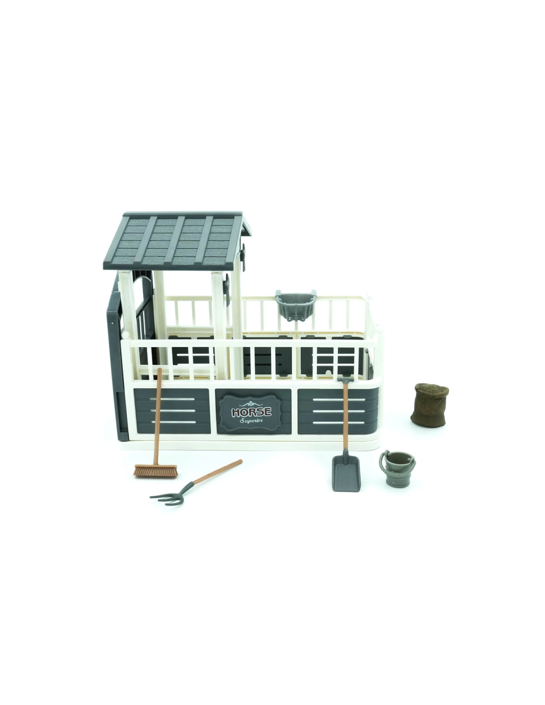 L'Ensemble Écurie pour Chevaux de Mojo est conçu pour inspirer l'imagination des enfants et enrichir leur collection de jouets équestres. Cet ensemble comprend une écurie clôturée gris et blanc avec porte de box, un sac de nourriture pour chevaux, un seau et des outils de nettoyage incluant une pelle, un balai et une fourche. Cet ensemble est compatible avec tous les chevaux à l'échelle 1:20, y compris les marques Mojo, Schleich, CollectA, Papo et plus encore.