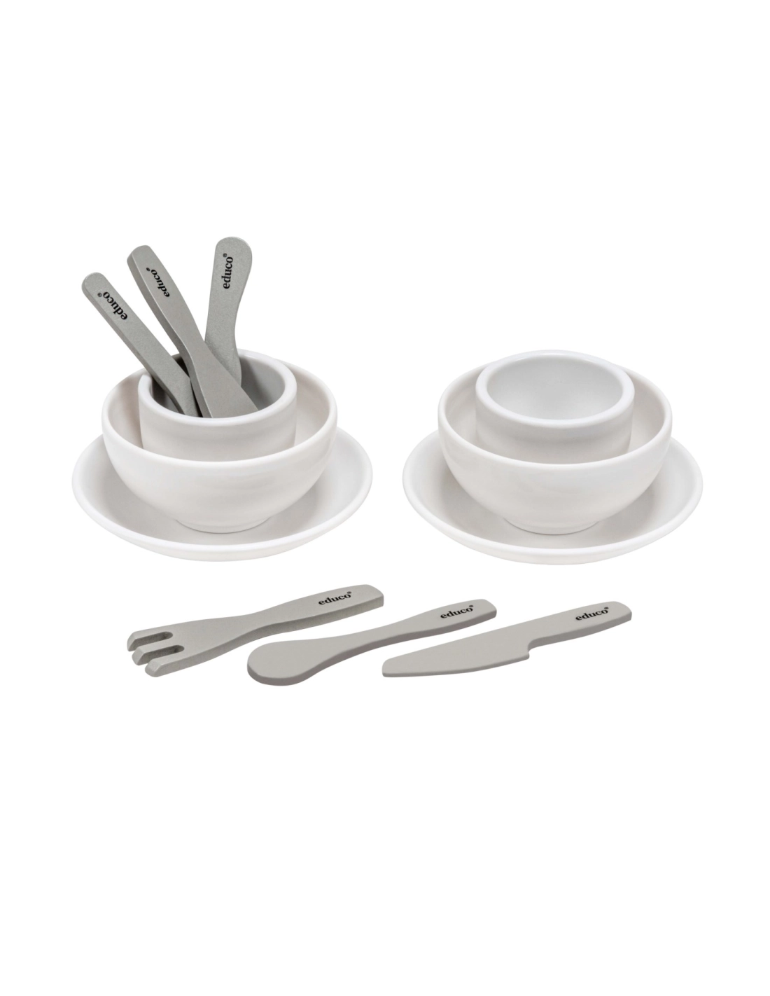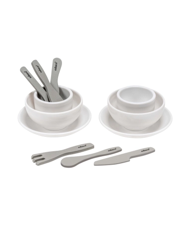 - Couverts (13 cm) : 2 cuillères, 2 fourchettes, 2 couteaux pour apprendre à manipuler chaque ustensile.