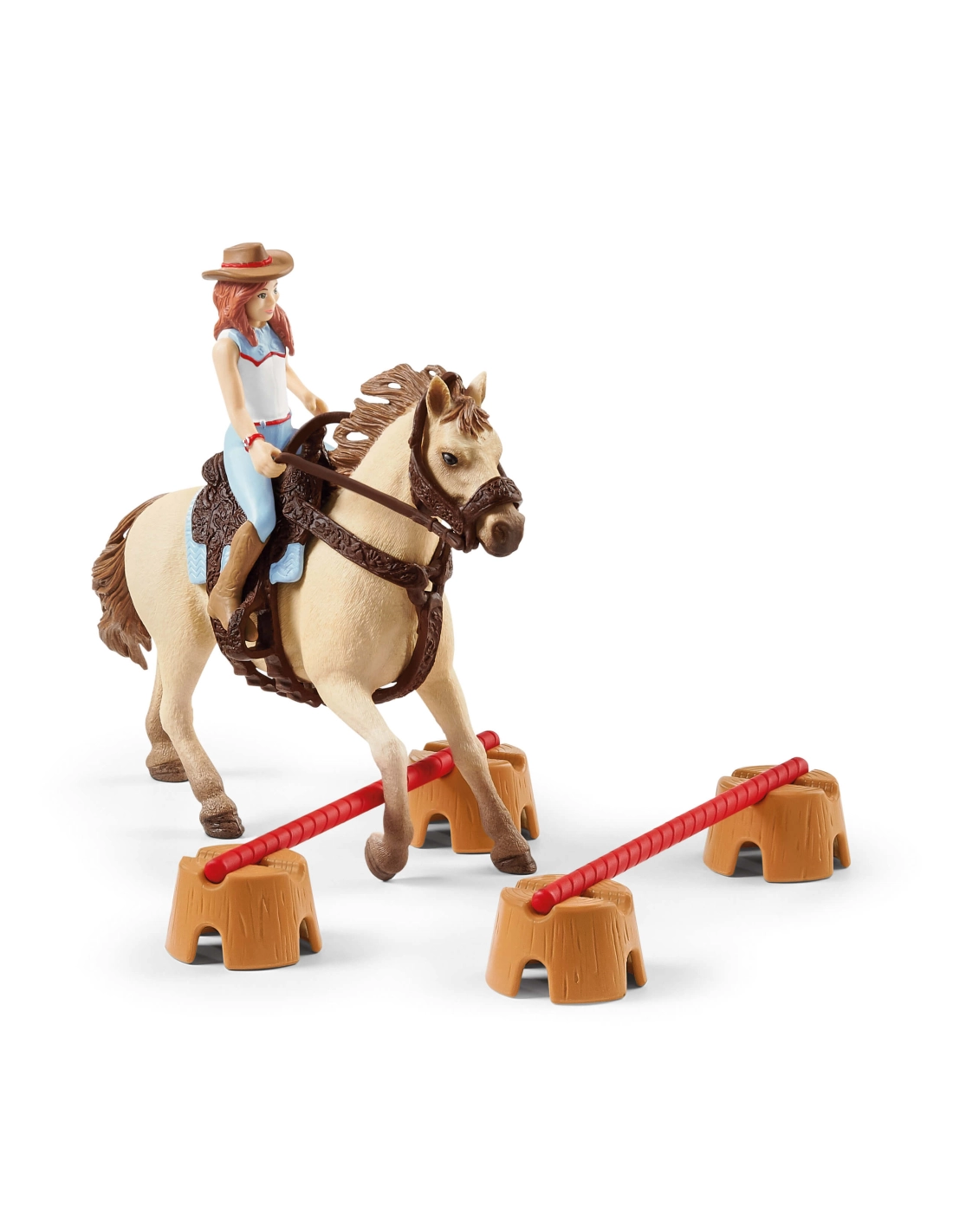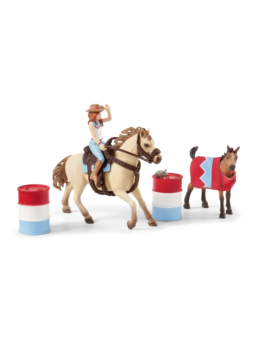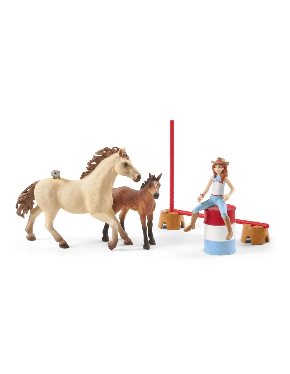 Contenu: 1 étalon Quarter Horse, 1 poulain Quarter Horse, 1 couverture pour poulain, 1 selle Western et bride, 1 fillette, 1 souris, , 2 tonneaux, 2 barres d’obstacle, 4 troncs d’obstacle.