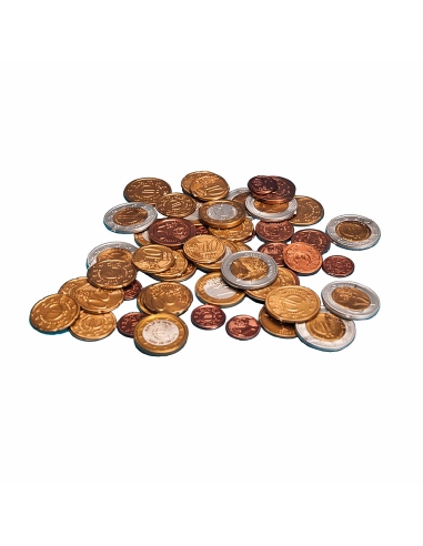80 pièces factices en euro pour jeux d’imitation, ateliers de calcul ou activités pédagogiques. Reproduction réaliste des pièces de 1 cent à 2 euros.