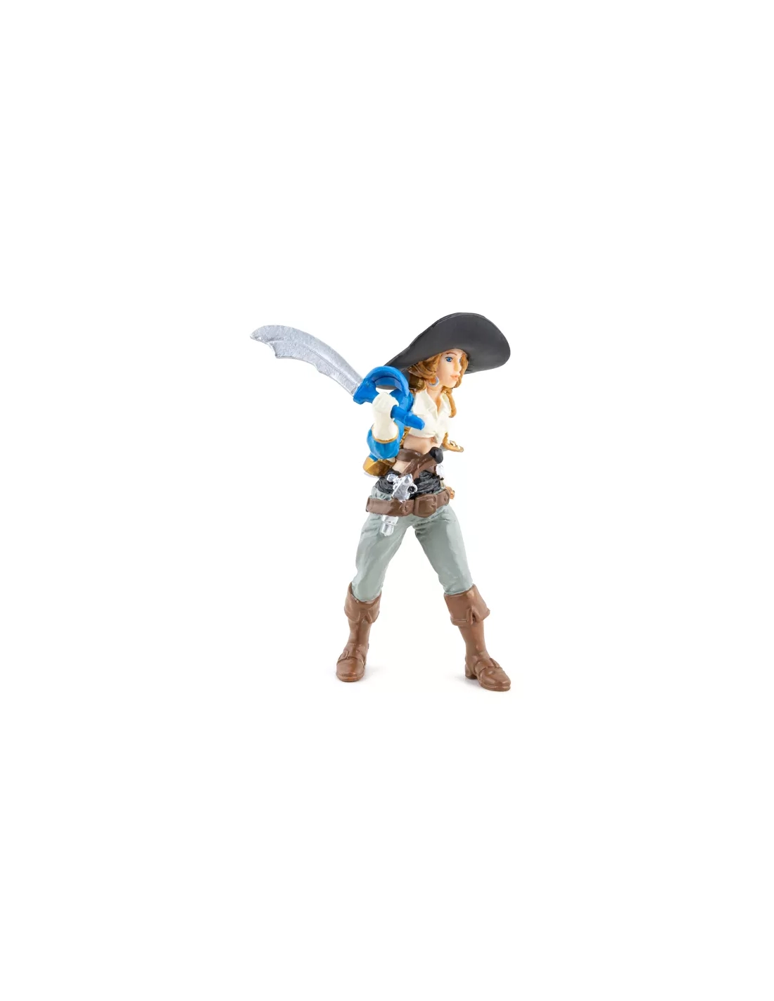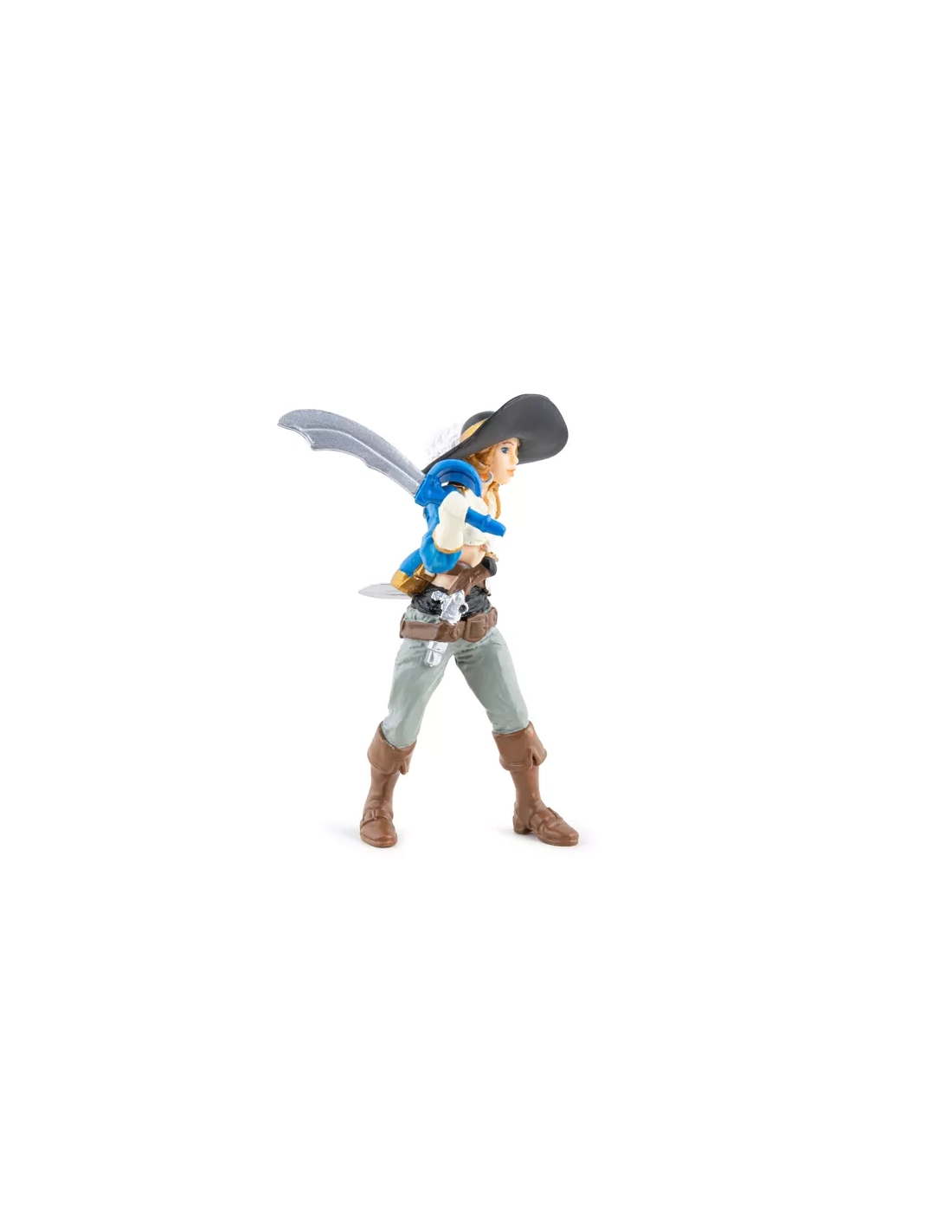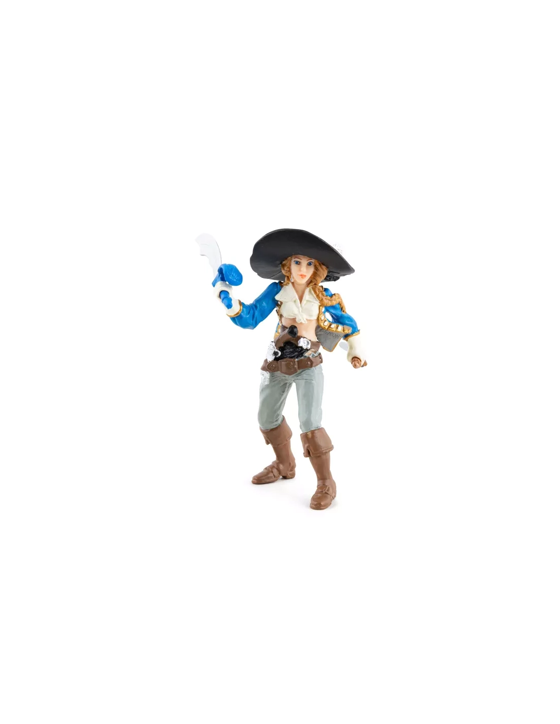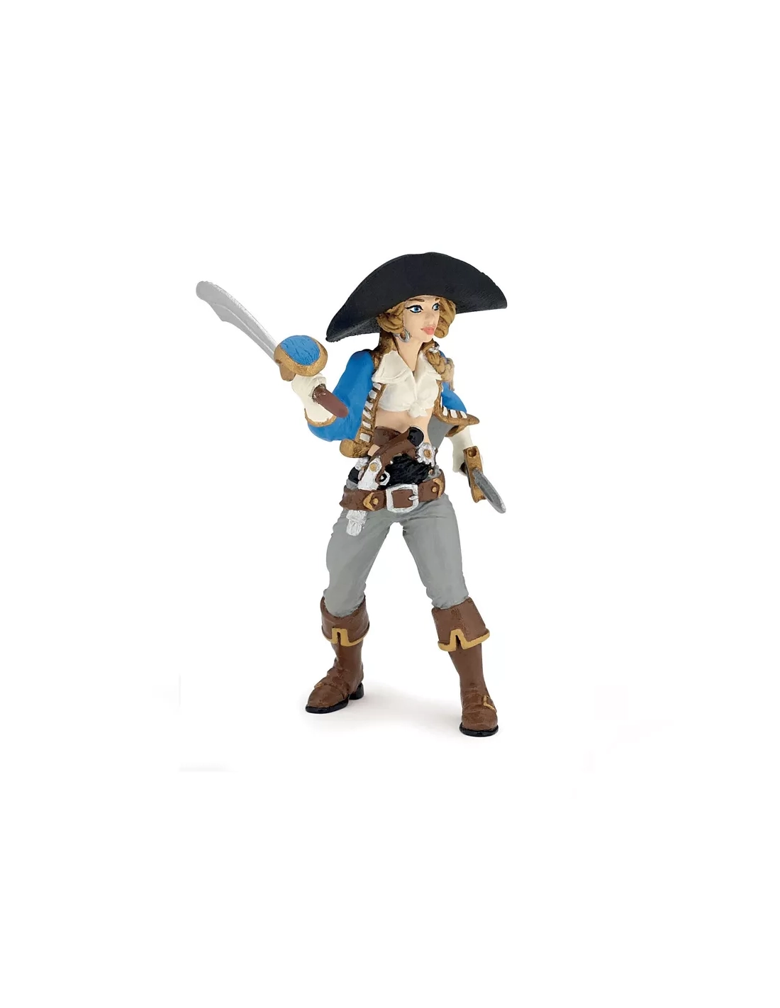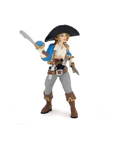 Veste bleue ajustée galonnée d'or, chemise blanche, larges bottes, ceinture de corsaire chargée d'armes. Sabre dans la main droite, poignard dans le dos, pistolet à silex à la ceinture. Posture droite, regard décidé : cette corsaire Papo ne donne pas l'impression d'attendre les ordres de quiconque. Elle armée et en mouvement — vers le pont adverse, vers le trésor ou vers le capitaine qui a commis l'erreur de la sous-estimer. Figurine peinte à la main, 10,5 cm de haut, collection Les Pirates et Corsaires.