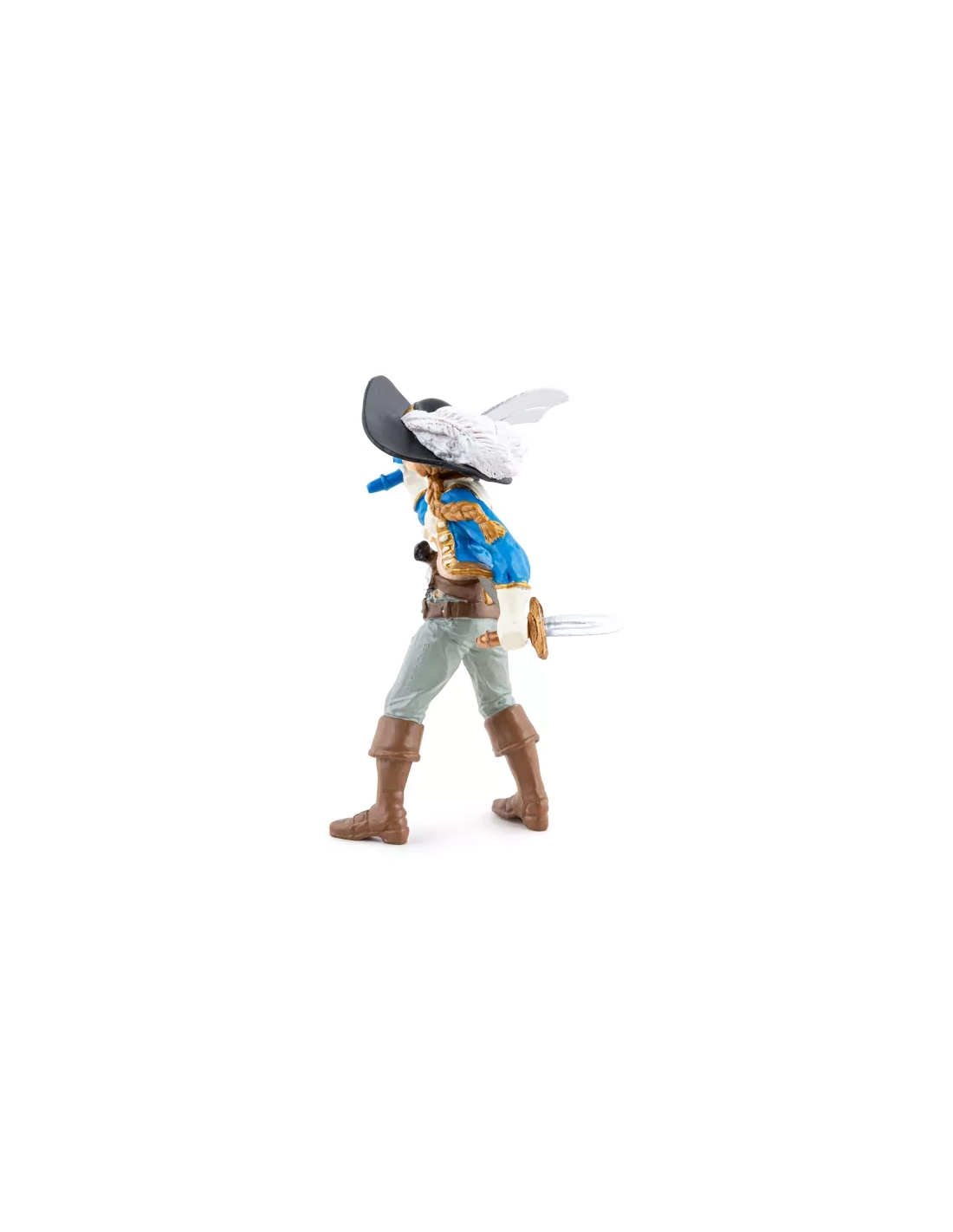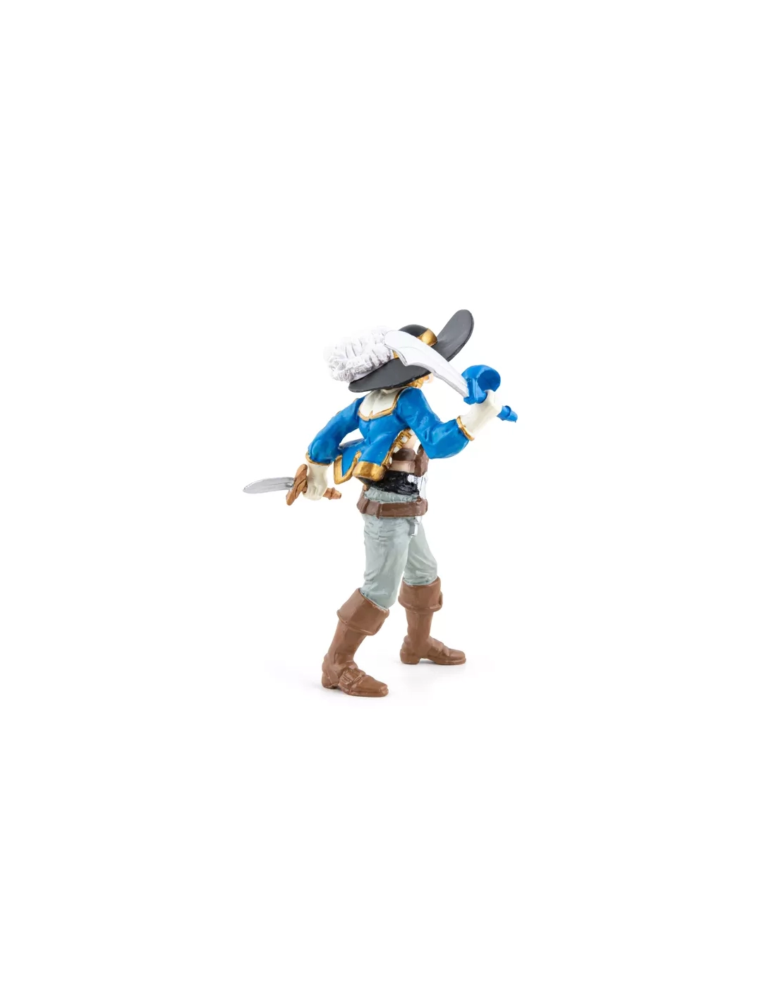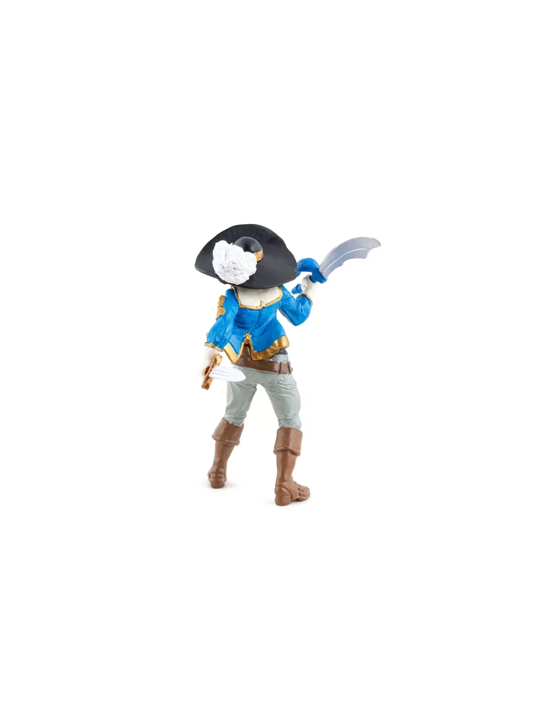 Veste ajustée avec des ornements dorés sculptés en relief : un costume de rang qui la place visuellement au même niveau d'autorité que les capitaines masculins de la gamme. Papo n'a pas habillé la Femme Corsaire en matelot — c'est un officier.