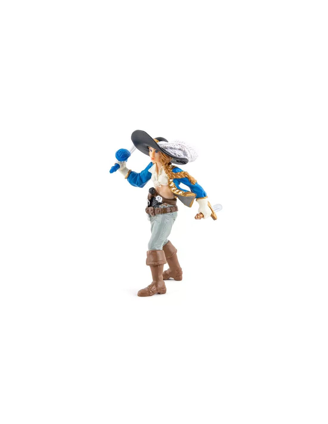 Trois armes sur une seule figurine de 10,5 cm : le sabre tenu en main, le poignard dans le dos, le pistolet à la ceinture. Une corsaire qui a prévu chaque phase du combat et ne s'en remet à personne d'autre pour assurer ses arrières.