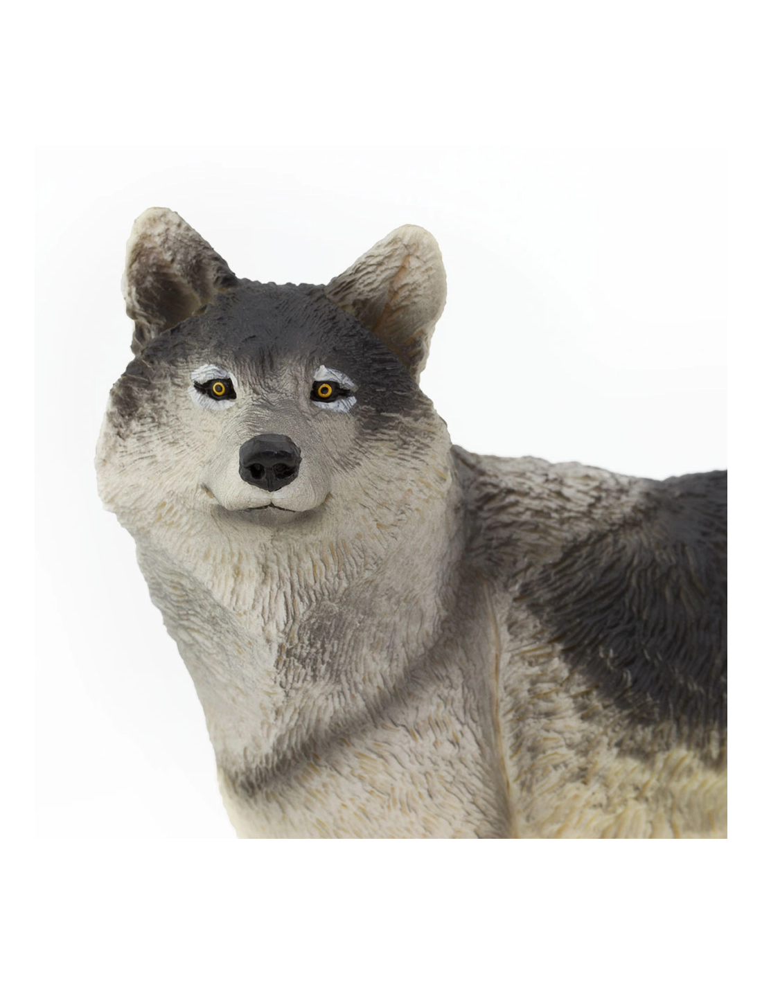 Cette figurine représente un loup gris en position d'affût, muscles tendus et regard perçant. Son pelage nuancé, sa posture de prédateur et ses détails anatomiques sont reproduits avec réalisme.