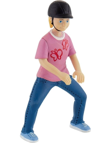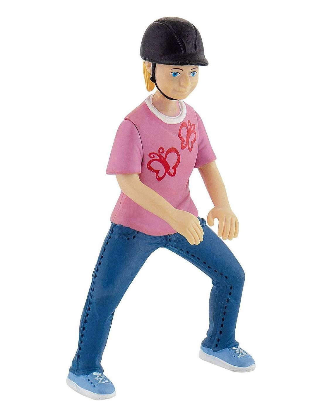 Emily est une figurine Bullyland représentant une jeune cavalière en tenue décontractée. Elle porte un t-shirt rose décoré de papillons, un pantalon d’équitation bleu et un casque noir pour la sécurité. Sa position permet de la placer à côté d’un poney, d’un box ou sur un tapis d’écurie, pour imaginer des histoires de soins, de pansage ou de premiers cours.