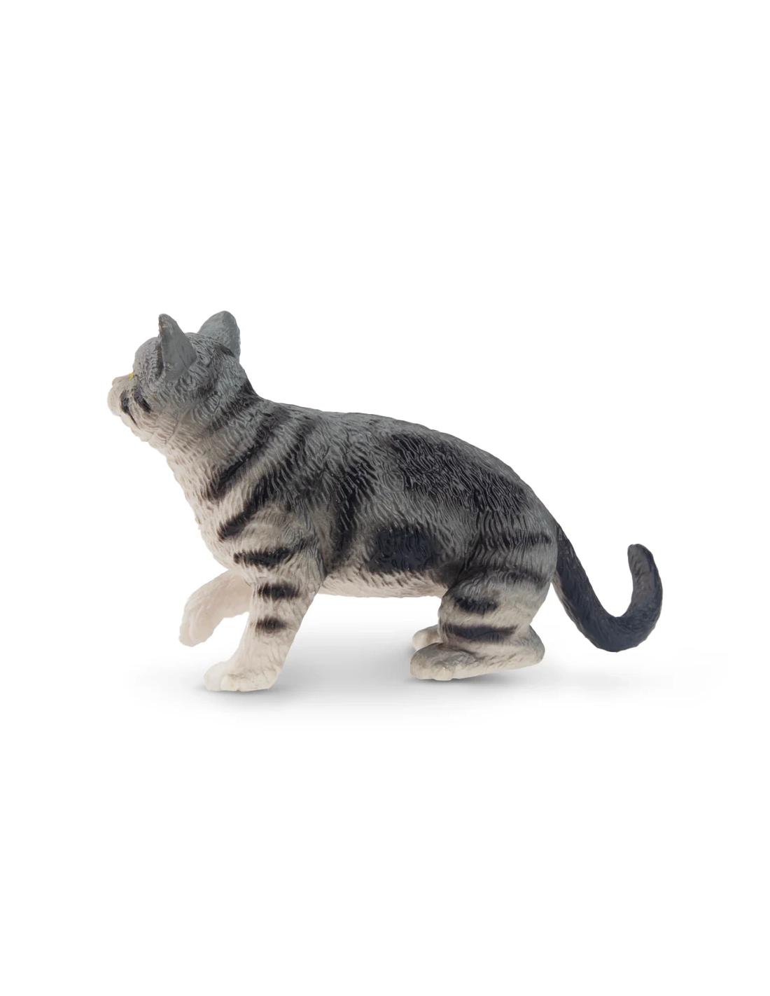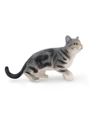 Cette figurine de chat tabby présente une coloration grise commune, avec les rayures verticales légèrement incurvées typiques d'un motif de style «maquereau». Notre silhouette de chat présente une expression curieuse sur son visage retroussé et une queue relevée et recourbée.