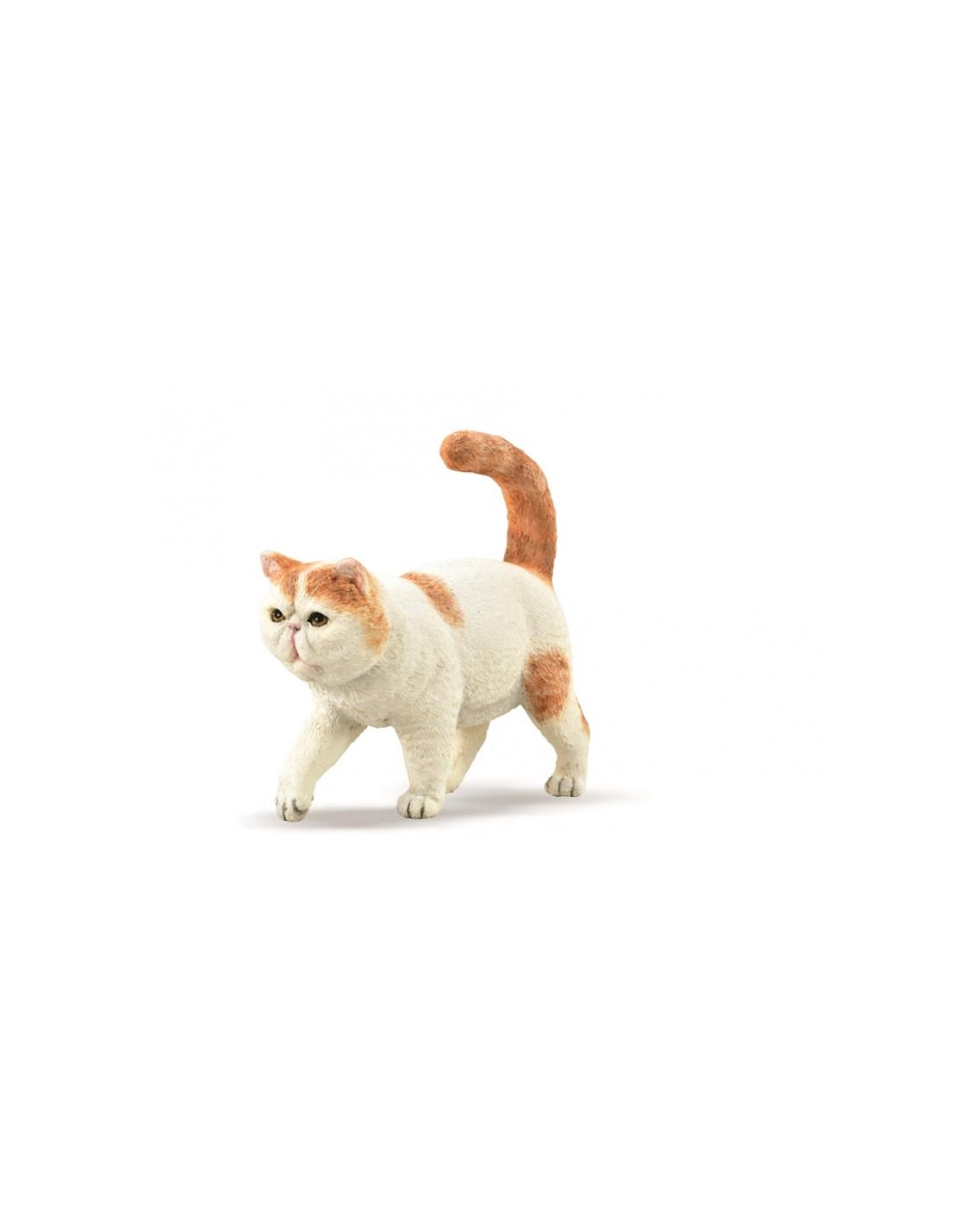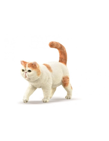 L'Exotic Shorthair est une race de chat développée comme une version à poil court du Persan. Le modèle CollectA montre clairement la caractéristique la plus distincte de cette race qui est la tête massive et ronde avec un visage plat. La fourrure est blanche avec des taches d'un ton orange. La posture montre un chat, s'avançant prudemment et posant doucement ses pattes