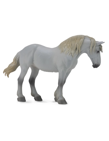 Percheron blanc Papo cheval trait français robuste. Race région Perche exportation États-Unis diligencier. Cheval puissant travail agricole transport lourd.