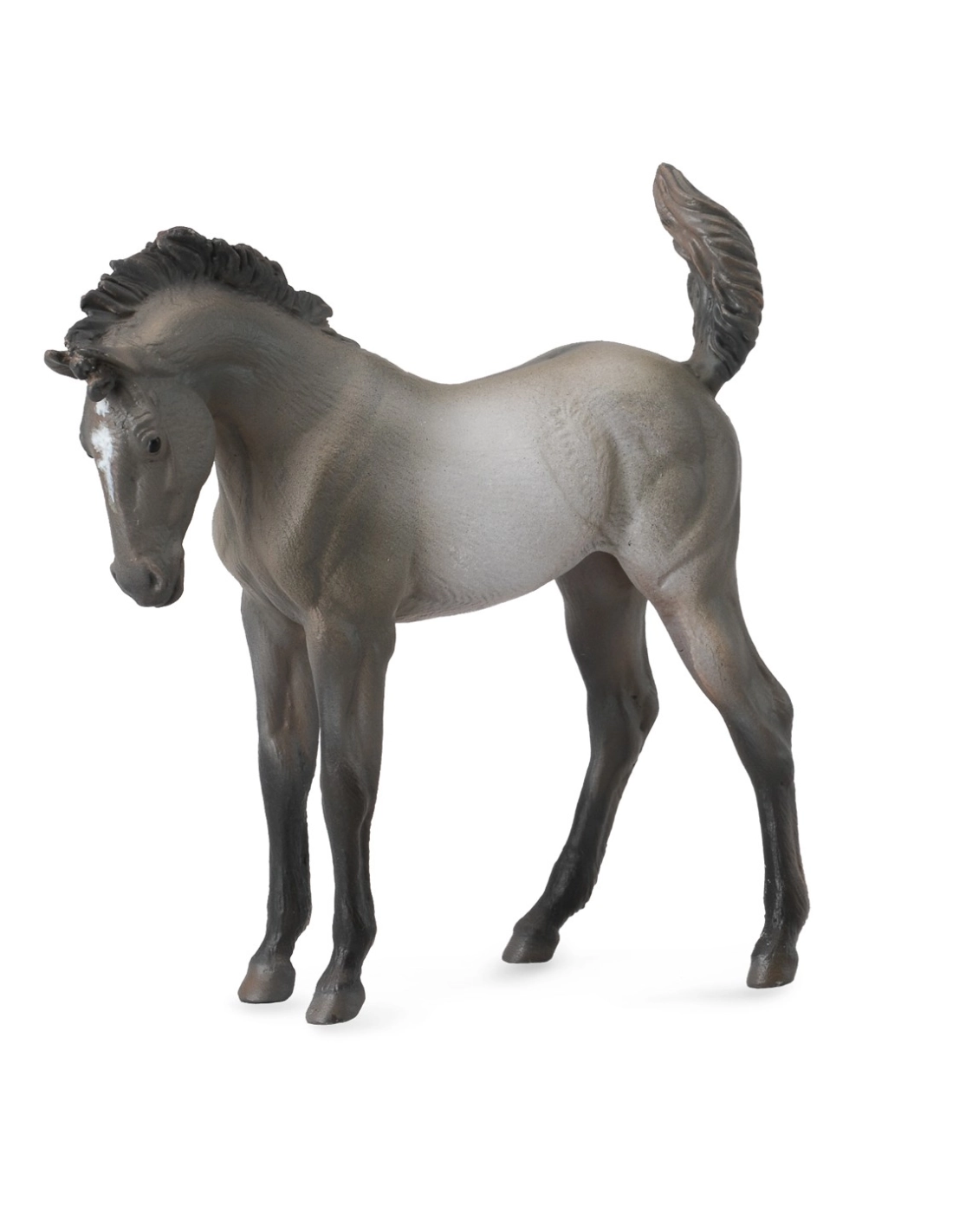 La couleur grullo est une robe particulière qui est assez rare chez les chevaux. Elle est caractérisée par une base de robe noire diluée, qui donne une apparence gris-ardoise. Les crins, la queue et les extrémités des membres sont également noirs. Le grullo est une couleur très prisée des amateurs de chevaux, et la figurine Mustang Collecta 88546 est une représentation très fidèle de cette robe rare et belle.