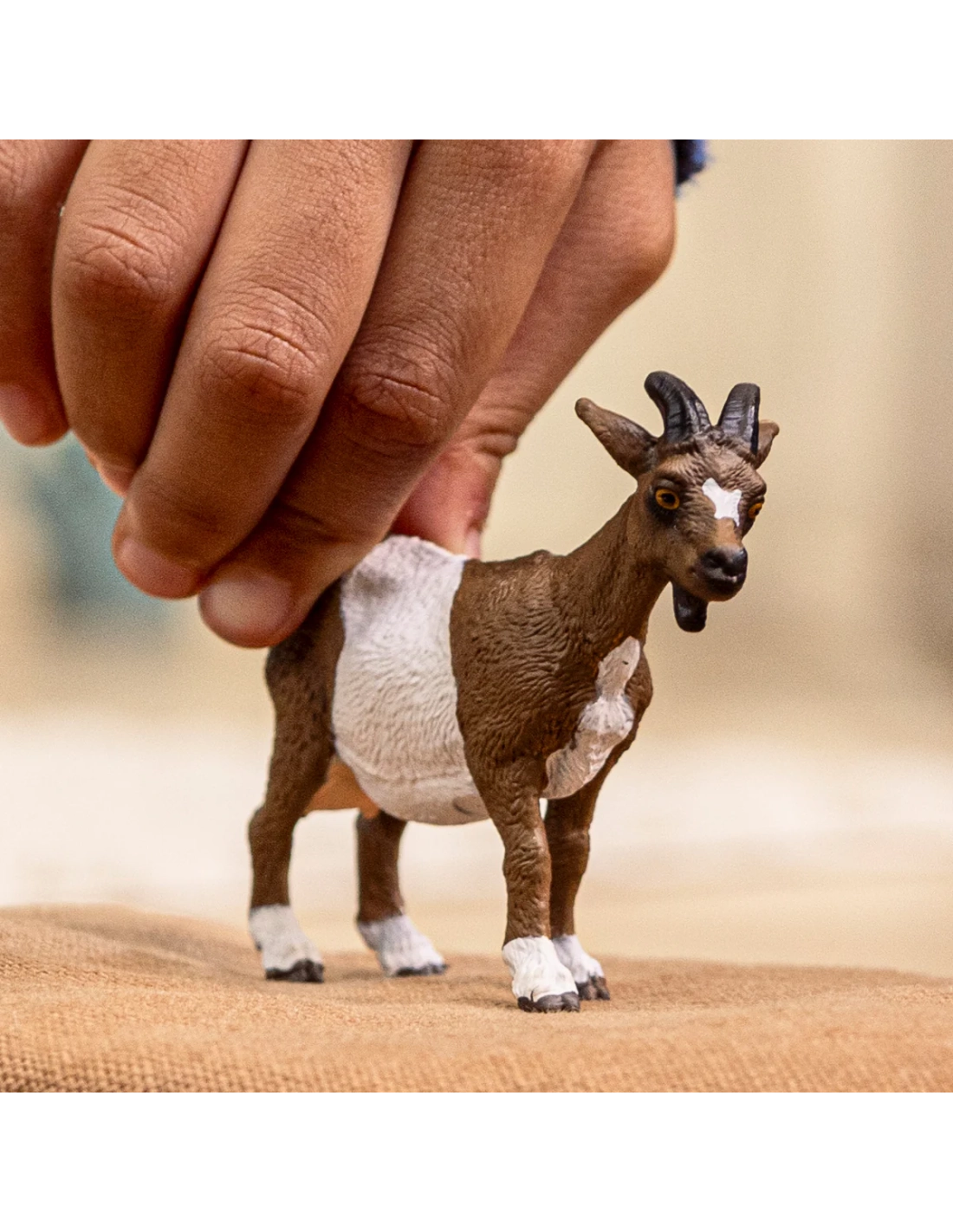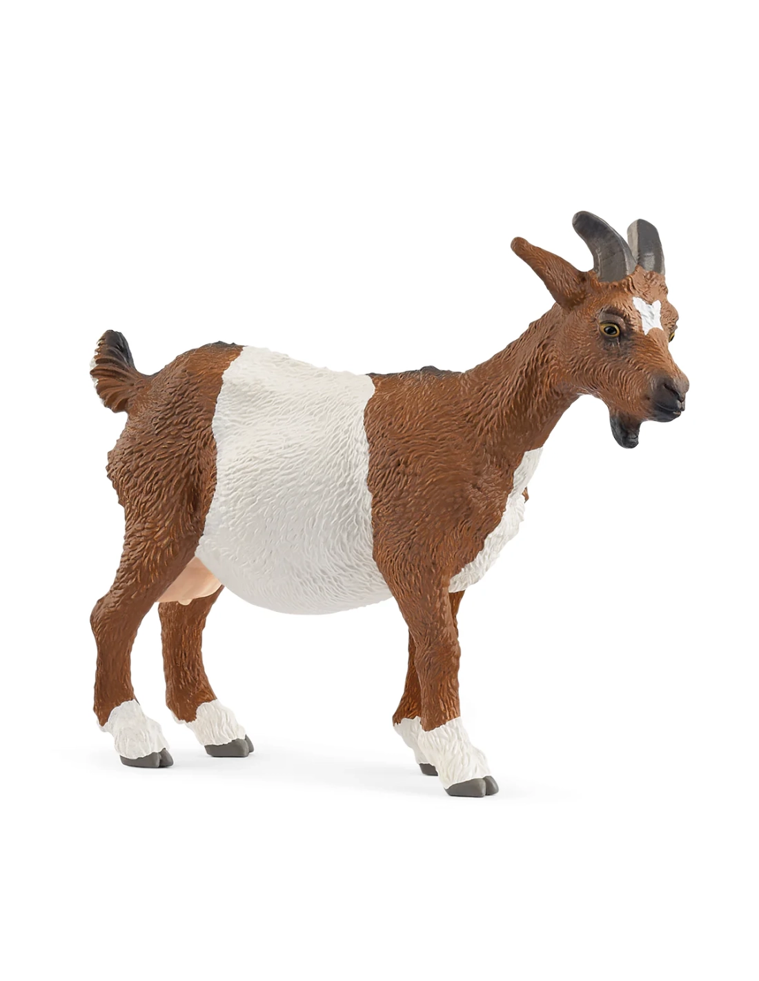 Cette chèvre avec son pelage blanc et brun, sa tache blanche en étoile sur le front et sa barbichette visible montre du tempérament à travers ses yeux jaunes. Bien plus qu'un simple jouet, cette figurine de l'univers des animaux de ferme reproduit ce mammifère domestique robuste et intelligent. Pour enrichir votre collection d'animaux de ferme et créer des scénarios ruraux authentiques.