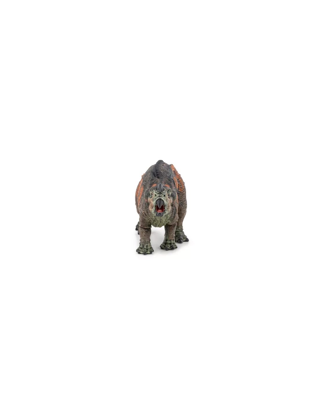 Le modèle Papo 55097 détaille la corne nasale courbe, les petites pointes frontales et la collerette percée de fenêtres, fidèles aux fossiles. Les nuances ocres rappellent les sols semi‑arides du Campanien. Cette figurine aide à comprendre la diversité des cératopsiens et l’évolution rapide de leurs ornements, un cas d’école de sélection sexuelle chez les dinosaures herbivores.