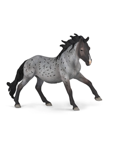 Posture dynamique, membres bien dégagés, queue flottant derrière lui : la figurine CollectA représente le Nokota dans son allure naturelle, le galop allongé qui rappelle ses origines de cheval semi-sauvage des prairies du Dakota du Nord. Robe rouan bleu à mouchetures noires irrégulières sur fond gris, crinière et queue noires : une robe rare et immédiatement reconnaissable.