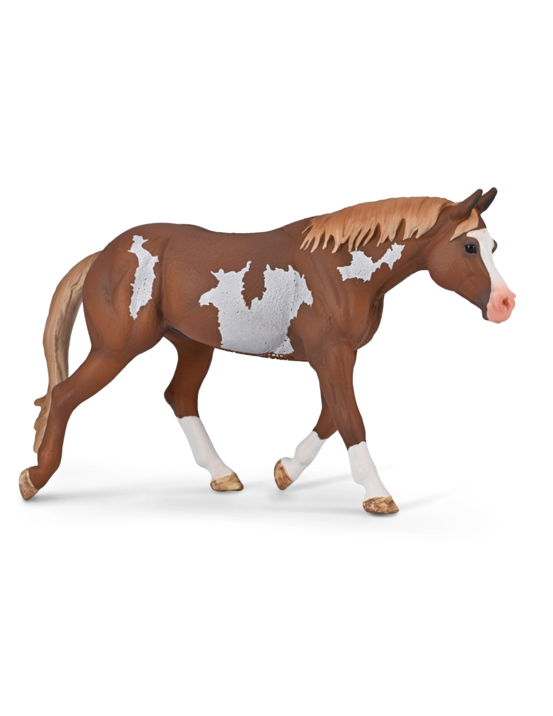 Idéale pour les jeux de rôle équestres, les maquettes d'écurie et les espaces de jeu libre : un Paint Horse dans sa robe overo typique, reconnaissable au premier coup d'oeil.