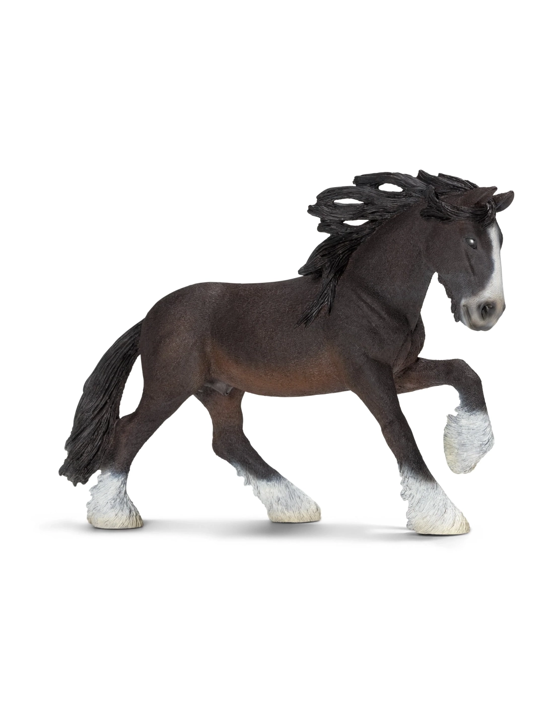 Cette figurine cheval reproduit un Étalon Shire selon les standards anglais (*Equus caballus*). Le modèle Schleich présente les fanons abondants et la morphologie massive de cette race détentrice de tous les records de taille équine mondiale.