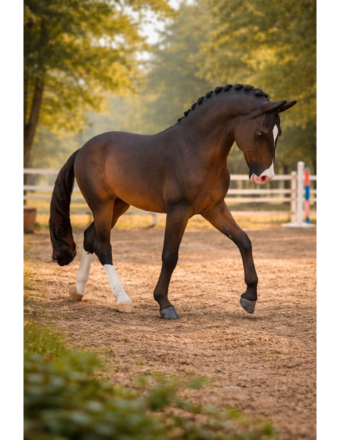 La crinière tressée, le trot rassemblé, la robe bai brun : une figurine qui parle directement à ceux qui fréquentent les carrières de compétition.