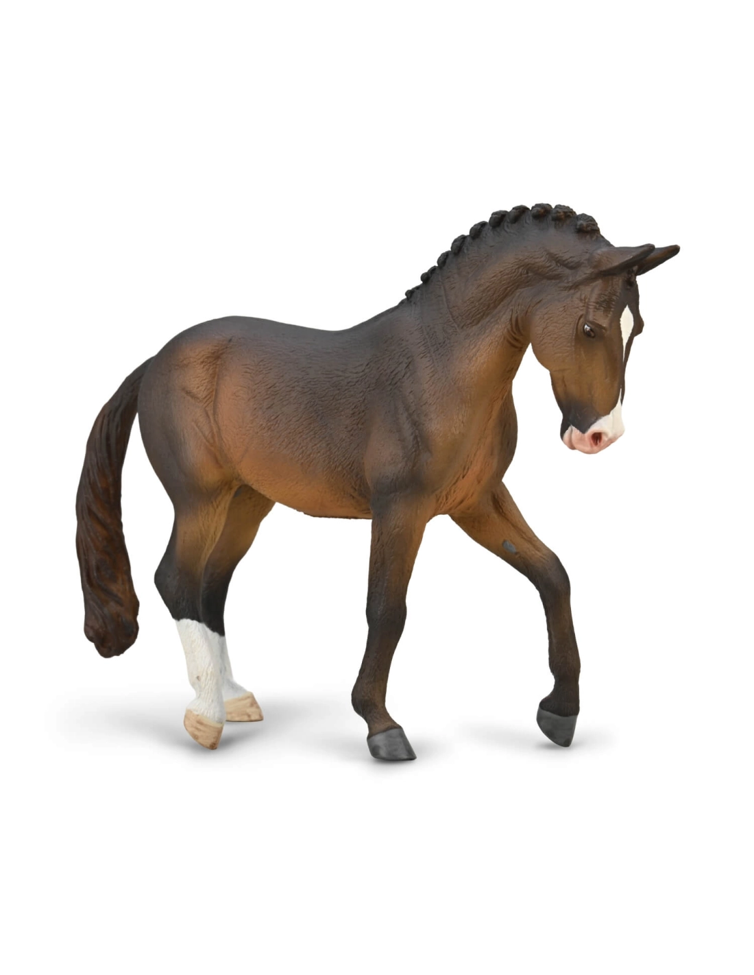 La gamme CollectA 1:20 est la référence pour les passionnés de races équines : chaque figurine est sculptée avec les détails propres à la race représentée. Ici, la crinière tressée, la posture au trot rassemblé et la robe bai brun sont des choix délibérés qui s'adressent à ceux qui reconnaissent un Trakehner en compétition sans avoir besoin de lire l'étiquette. Peinte à la main, 15,5 x 11,5 cm.
