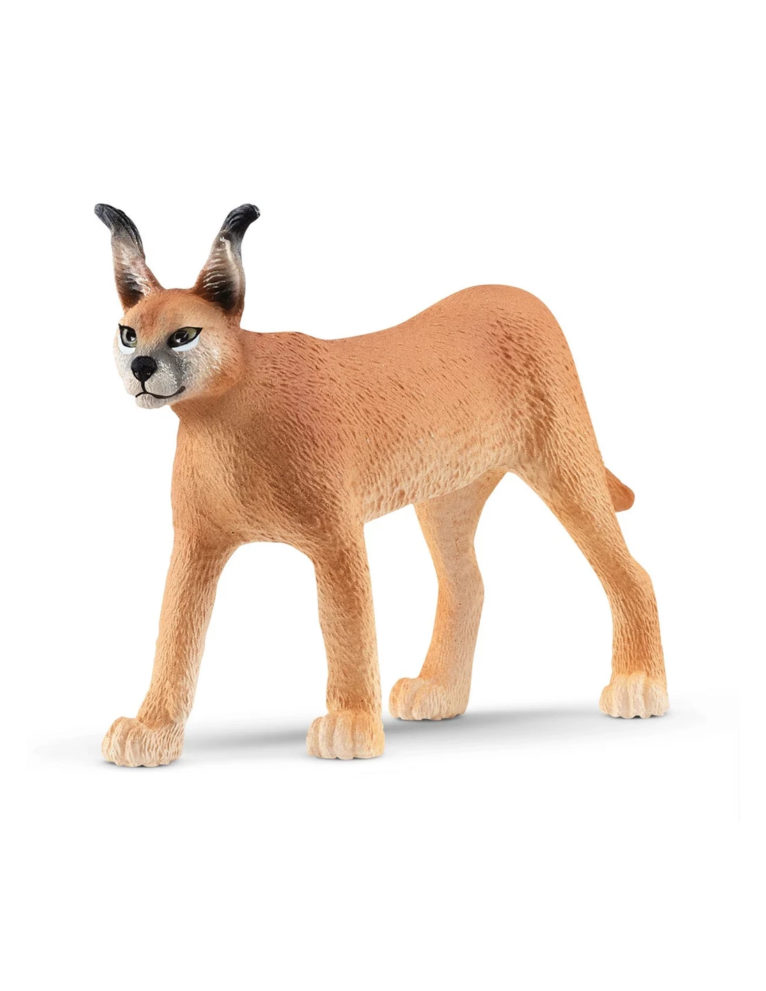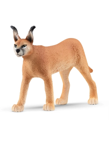 Cette figurine félin réaliste reproduit une Femelle Caracal, chasseuse spécialisée des steppes africaines (*Caracal caracal*). Le modèle Schleich présente les oreilles à pinceaux caractéristiques et la morphologie élancée de ce félin adapté aux environnements arides.