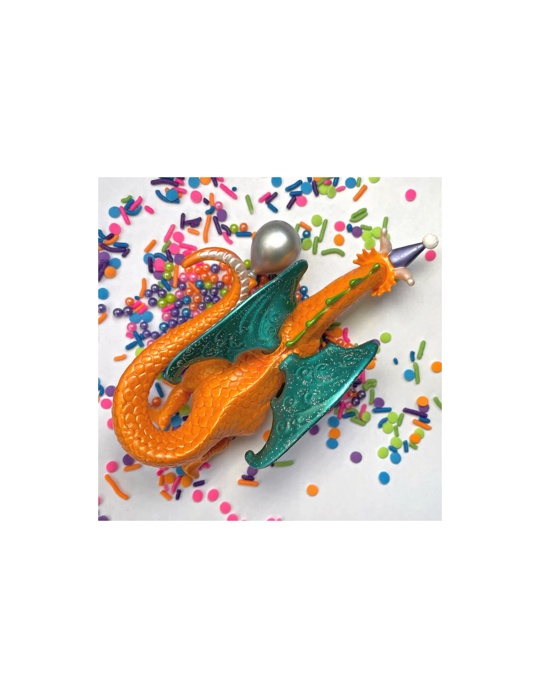 - Couleurs : Festus arbore des écailles orange métalliques éclatantes et des ailes turquoise étincelantes, parfaites pour se démarquer dans n'importe quelle fête. Il porte également un chapeau festif coloré et tient un ballon argenté dans sa patte.
