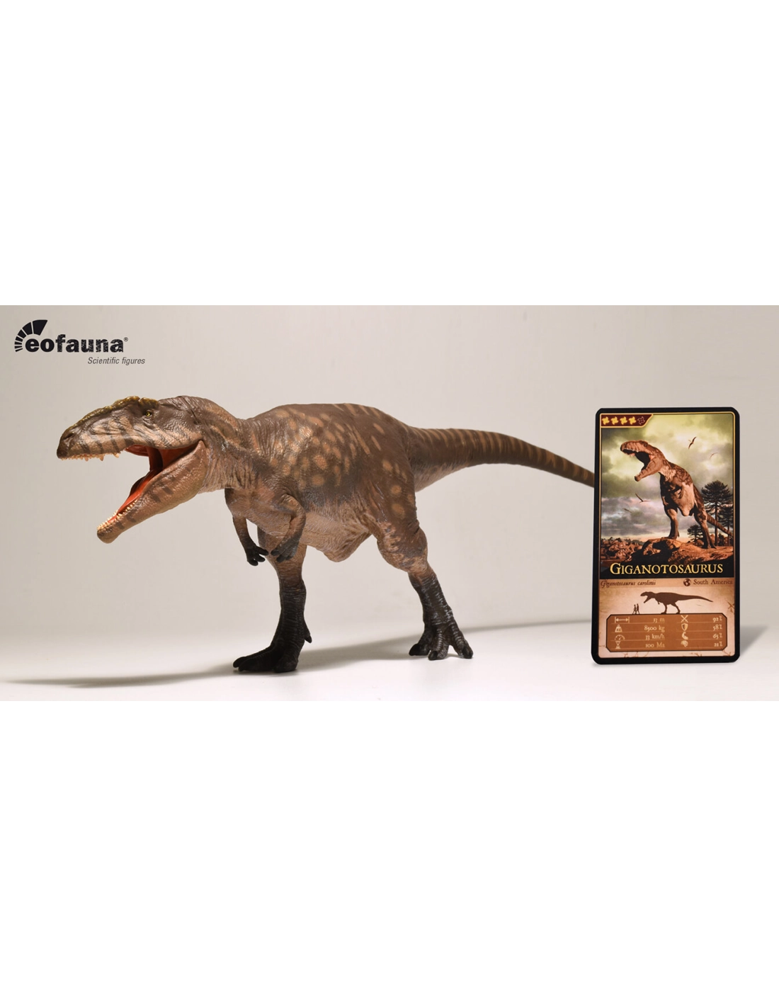 Impressionnante figurine du Giganotosaurus, un des plus grands prédateurs terrestres de tous les temps, magnifiquement réalisée par Eofauna. Un incontournable pour tout passionné de dinosaures.