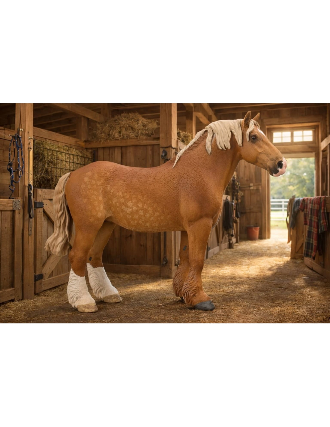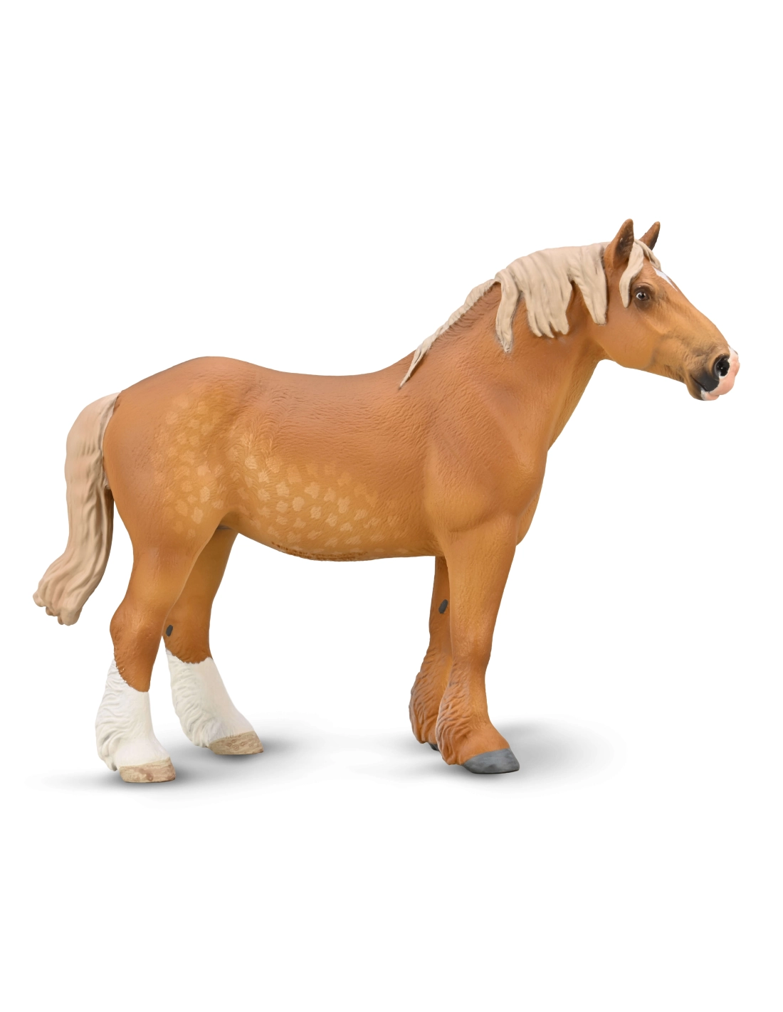 Cette combinaison alezan froment, crinière lin et pommelures est la plus représentée dans les concours de Traits Belges en Belgique et en France. C'est elle que CollectA a choisie pour cette figurine, et c'est celle que reconnaissent immédiatement tous les habitués des concours de trait.