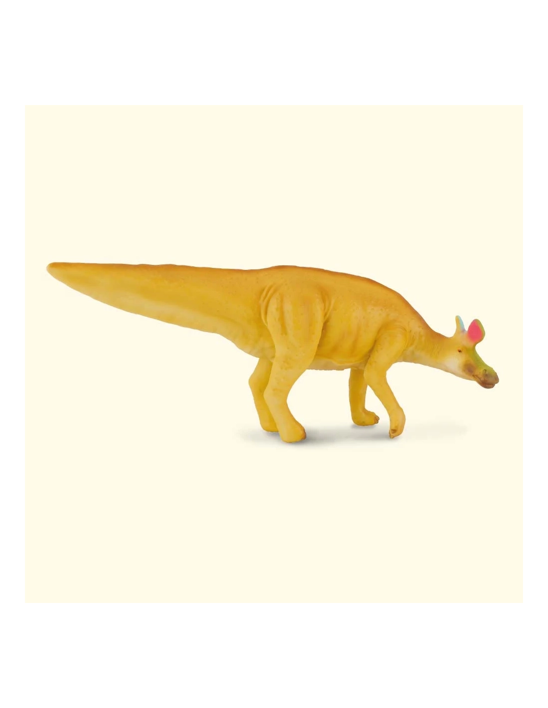 Crête bilobée en forme de hachette caractéristique, prolongée vers l'arrière par une projection osseuse pleine. Posture mixte bipède-quadrupède, museau allongé terminé par un bec édenté, queue raidie portée à l'horizontale. Texture de peau gravée et coloration ocre tachetée peinte à la main.
