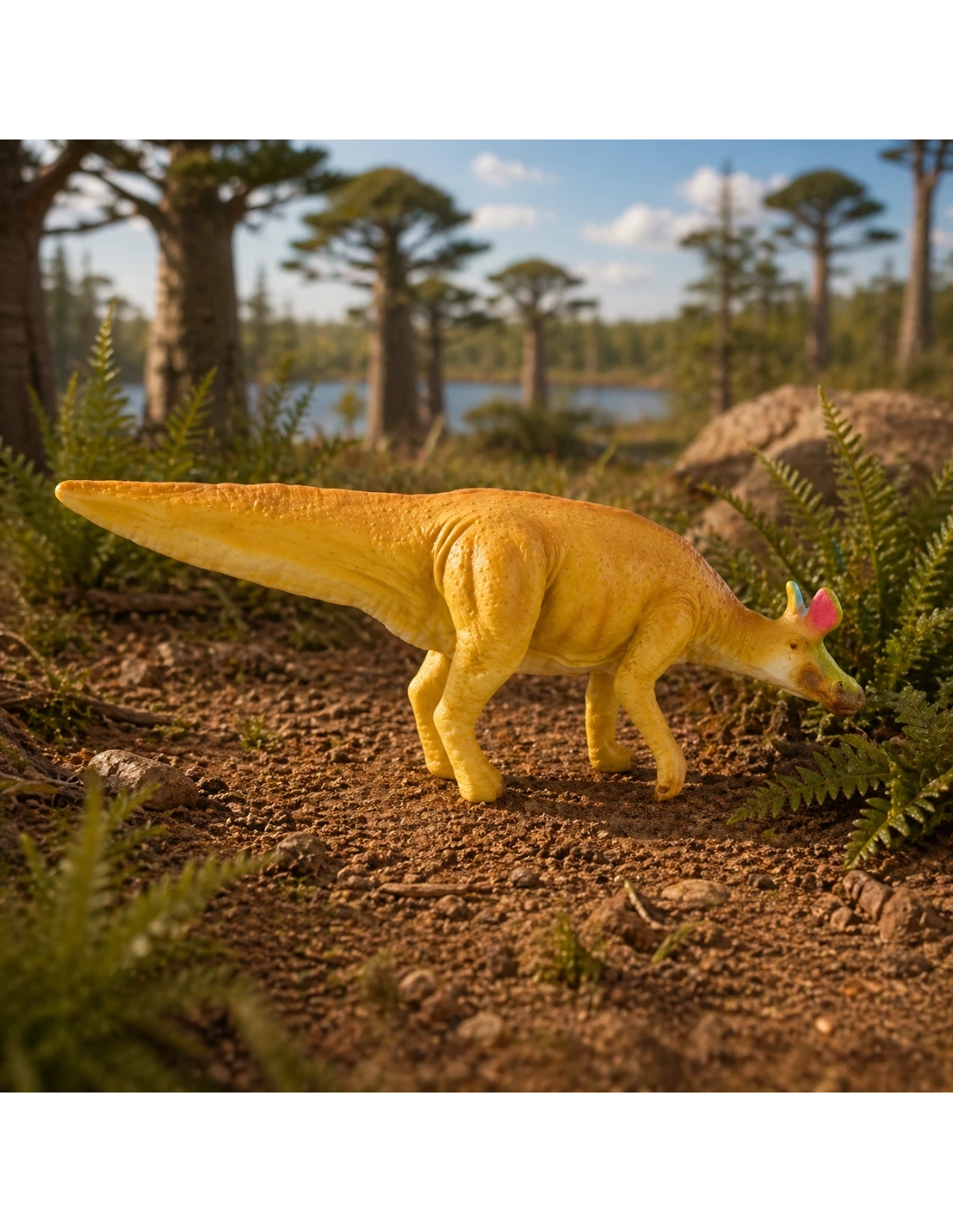 Cette figurine CollectA reproduit le Lambeosaurus, hadrosauridé canadien à crête en hachette qui a donné son nom à la sous-famille des Lambeosaurinae. Décrit par William Parks en 1923, il a été baptisé en hommage à Lawrence M. Lambe, paléontologue canadien pionnier de l'étude des dinosaures de l'Alberta.