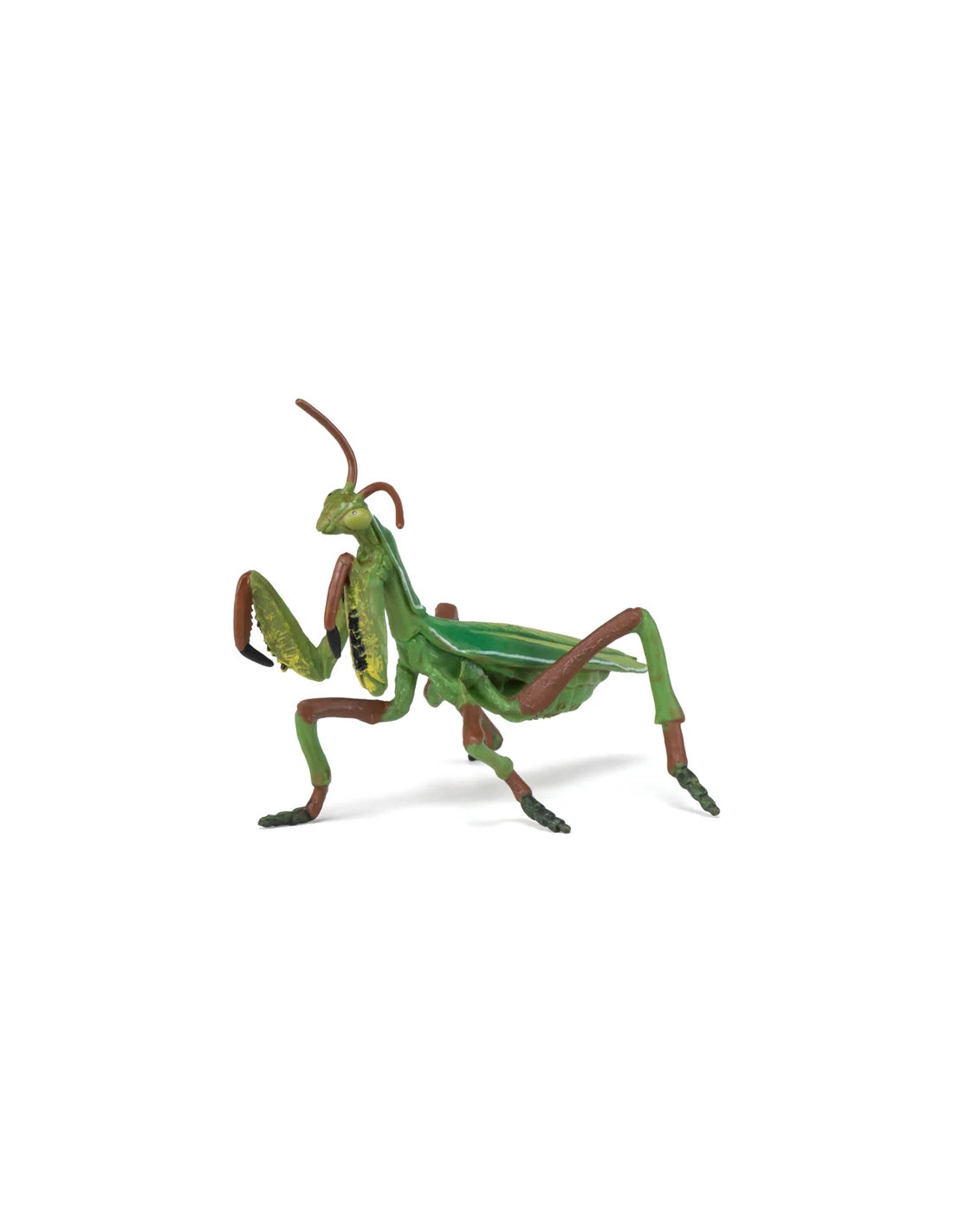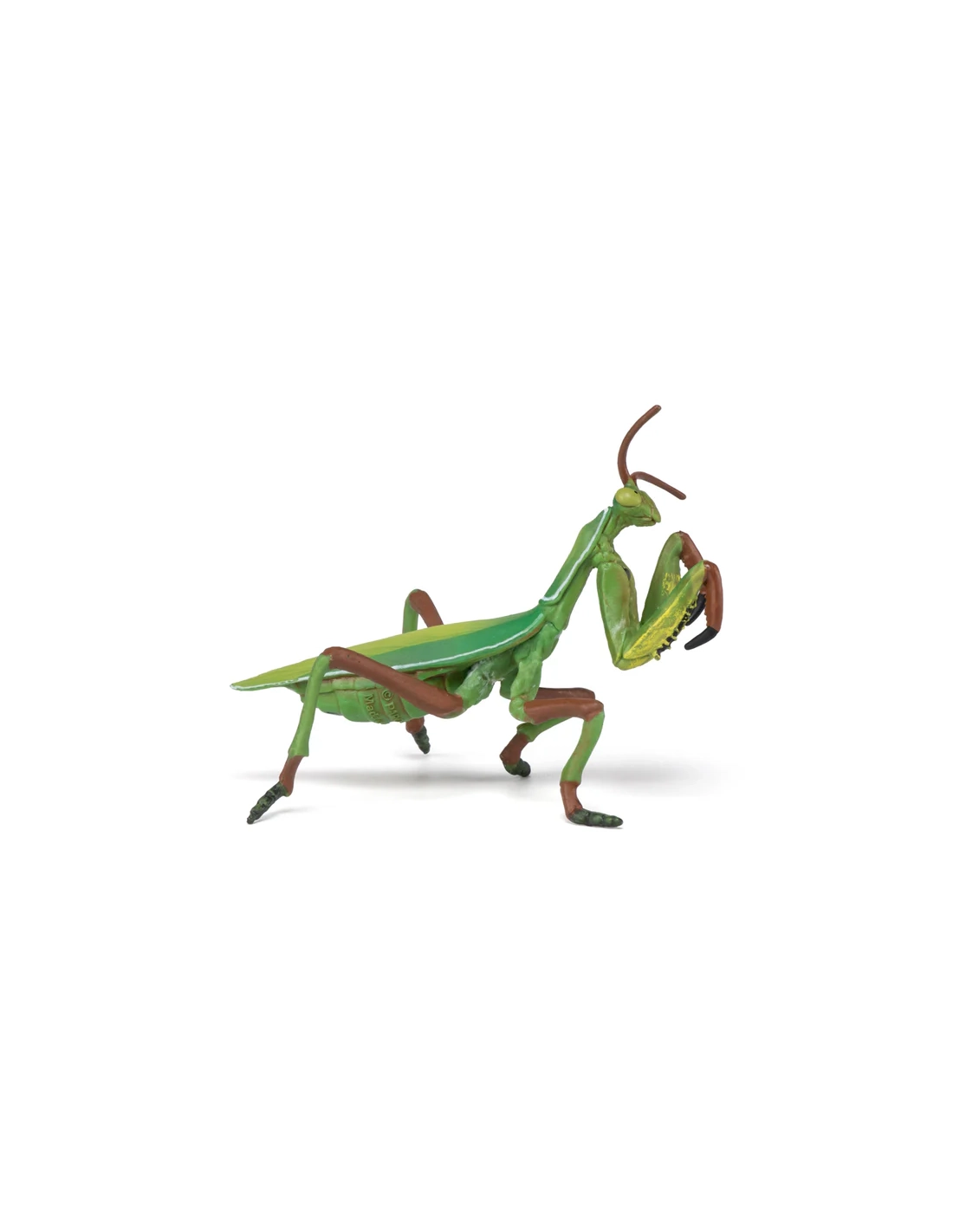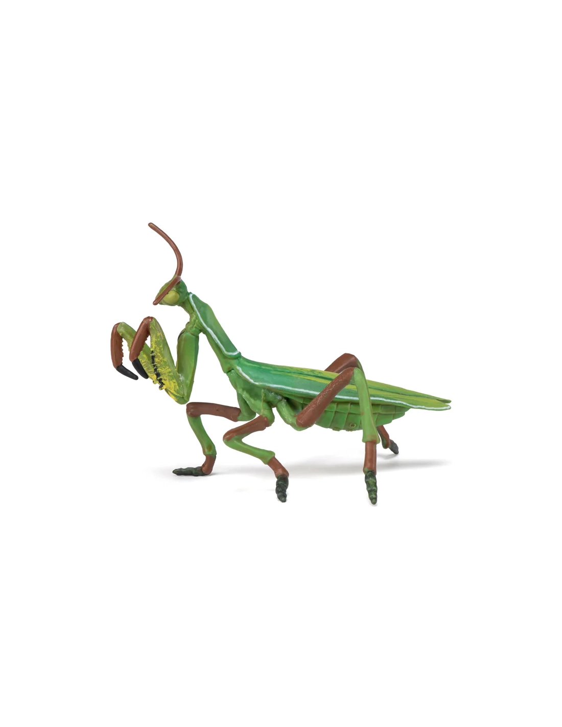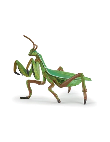 Le modèle restitue fidèlement la posture caractéristique de la mante religieuse, pattes ravisseuses prêtes à saisir une proie. Les segments du corps, les antennes fines et la silhouette allongée évoquent son mode de vie discret et patient. La coloration verte renforce son camouflage naturel dans la végétation.