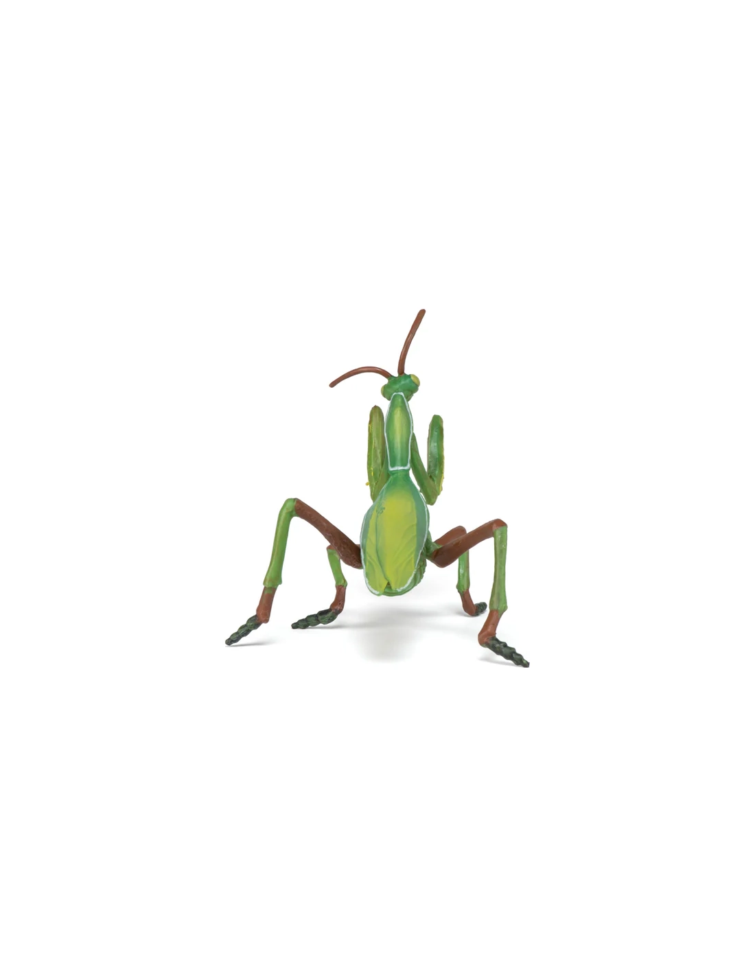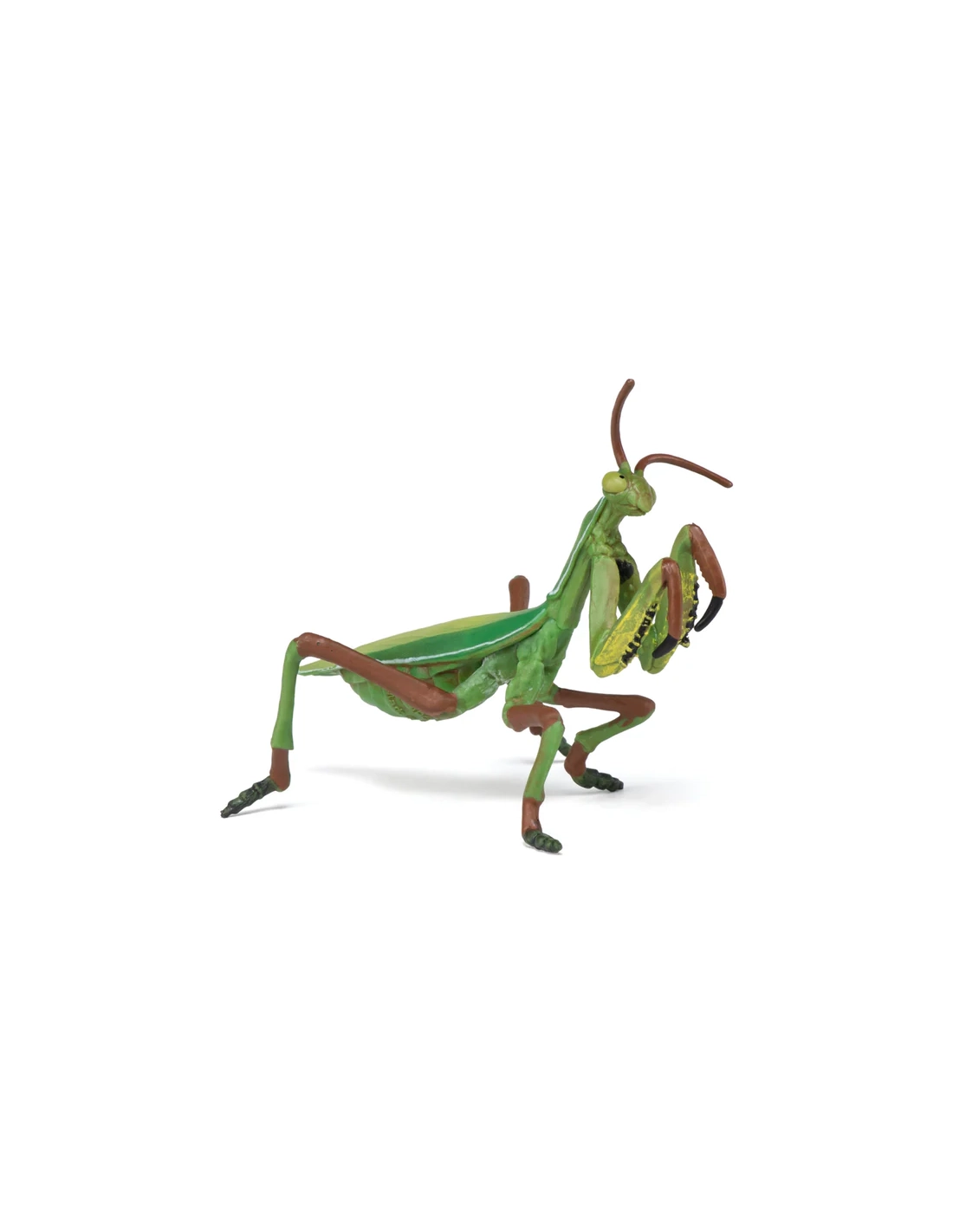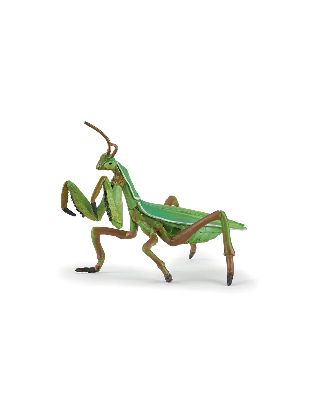 Le modèle restitue fidèlement la posture caractéristique de la mante religieuse, pattes ravisseuses prêtes à saisir une proie. Les segments du corps, les antennes fines et la silhouette allongée évoquent son mode de vie discret et patient. La coloration verte renforce son camouflage naturel dans la végétation.
