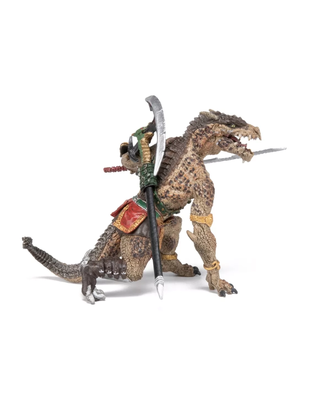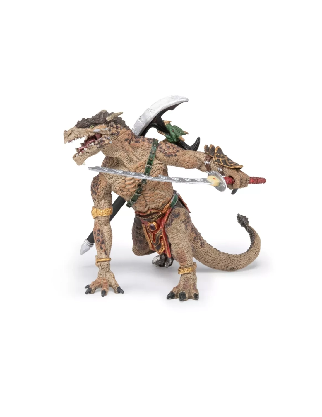 Cette figurine Mutant dragon Papo incarne un combattant reptilien mi-humain mi-dragon, taillé pour l’action. Sa posture basse et tendue suggère l’assaut, la gueule entrouverte laissant voir des crocs acérés. Entre la garde d’un donjon et les ruelles d’une cité médiévale-fantasy, il impose une présence immédiate sur la table de jeu ou dans une vitrine.
