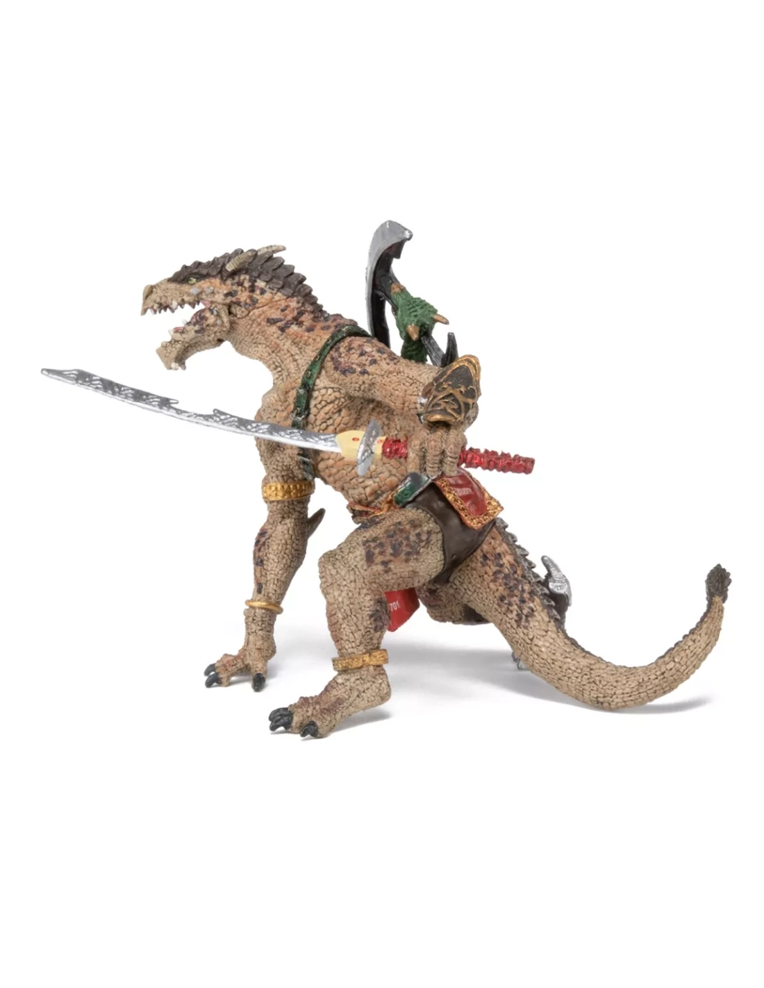 Créez un scénario où un clan d’hommes-dragons défend un portail ancien contre des aventuriers. Associez-le à des chevaliers, sorciers et créatures mythiques pour composer une scène « donjon & dragons » maison. Côté apprentissages, la figurine stimule langage, narration et structuration du récit (décrire l’armure, les armes, les intentions du personnage, le décor).