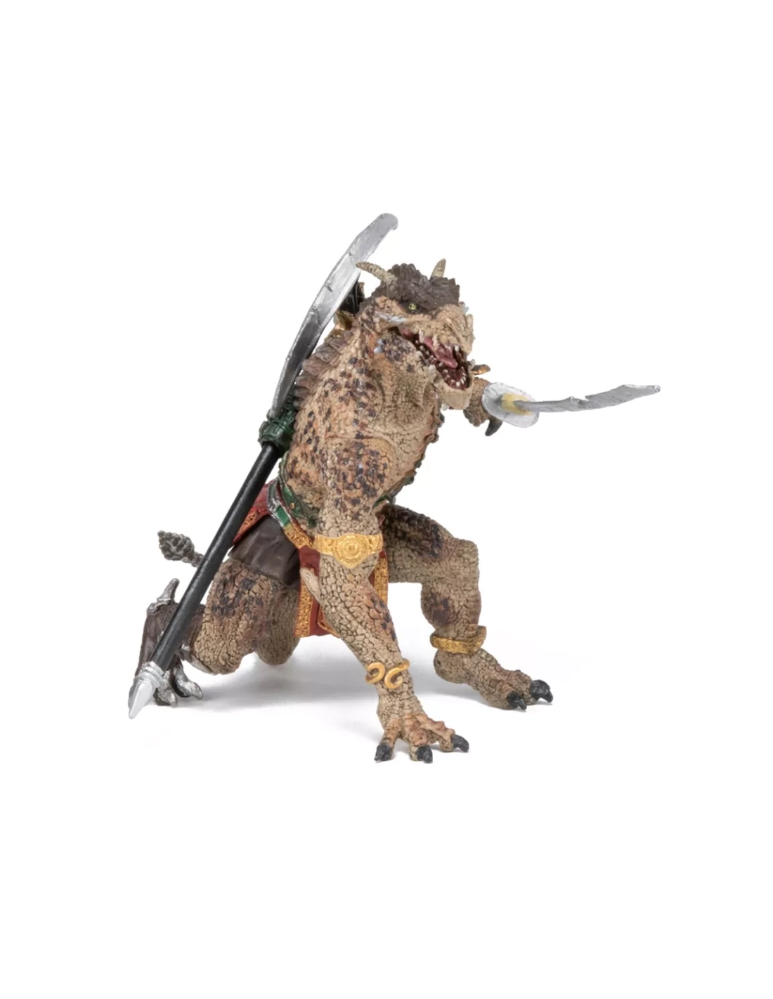 Le sculpt met en valeur des écailles irrégulières, des crêtes dorsales et des cicatrices de bataille. La peinture nuancée (ocres, beiges, touches vert sombre) renforce l’effet cuir/écaille. L’équipement mêle acier et cuir : hallebarde à longue hampe portée dans le dos, lames courbes aux poignets, anneaux et ceinturons décorés. Le résultat est lisible, contrasté et photogénique pour vos dioramas.