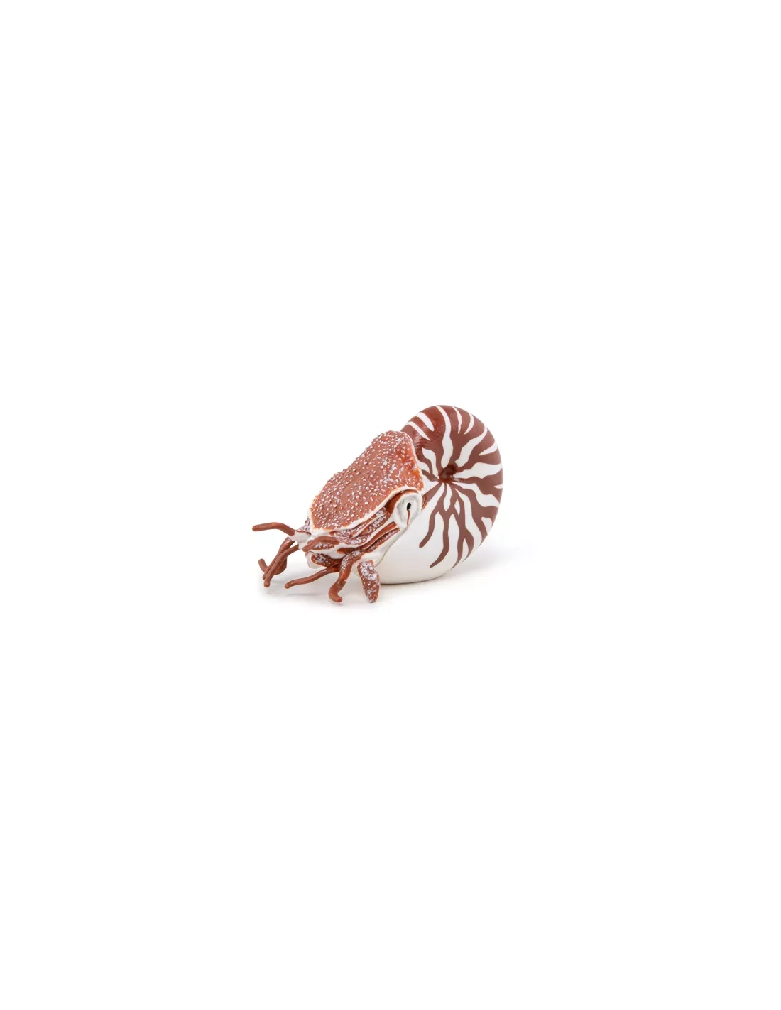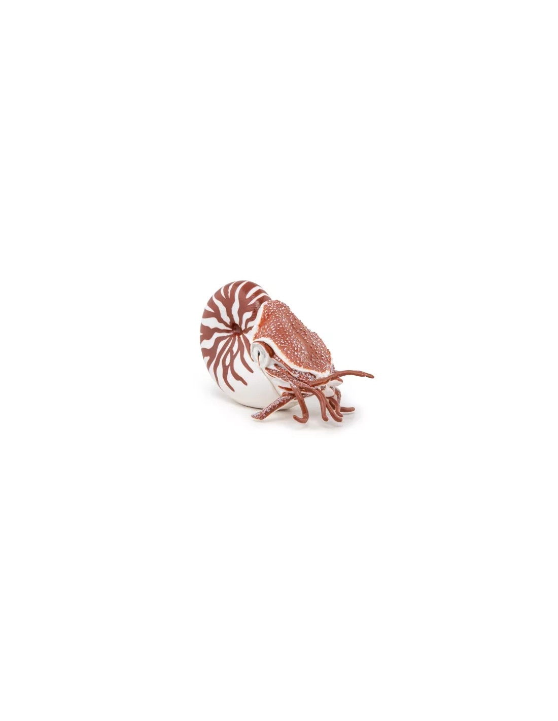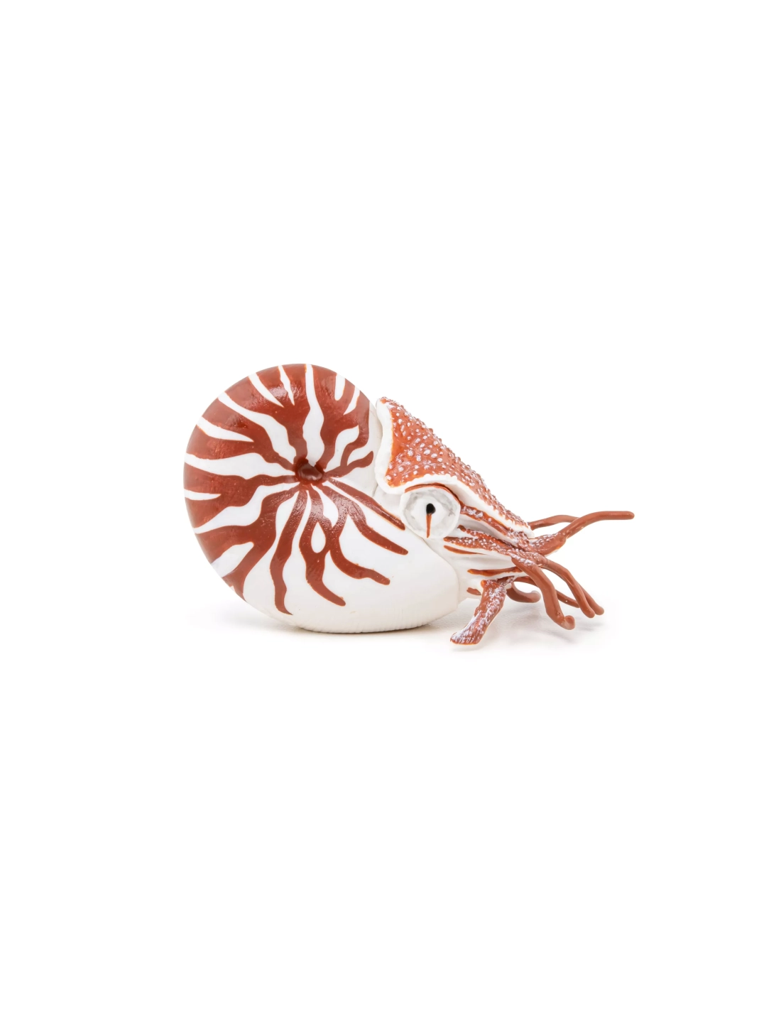 Coquille spiralée blanc nacré zébrée de flammes brun-roux, capuchon granuleux orange tacheté de blanc, tentacules fins et striés qui s'échappent de l'ouverture : la figurine Nautile Papo est l'une des plus belles et des plus instructives de la collection L'Univers Marin. Elle représente Nautilus pompilius dans sa posture naturelle d'émergence de la coquille, avec une précision anatomique remarquable — jusqu'aux détails du capuchon protecteur et à l'œil visible sur le côté. Un animal qui fascine autant les géologues que les biologistes.
