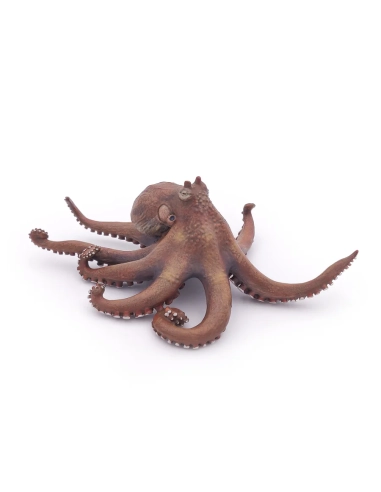 Corps brun-roux marbré, peau granuleuse couverte de papilles, huit bras étalés portant des rangées de ventouses blanches parfaitement sculptées, œil expressif en position latérale : la figurine Pieuvre Papo restitue avec une remarquable précision anatomique la grande pieuvre commune, Octopus vulgaris. La posture rampante sur le fond, bras déployés dans toutes les directions, est exactement celle qu'on observe en plongée sur les substrats rocheux.
