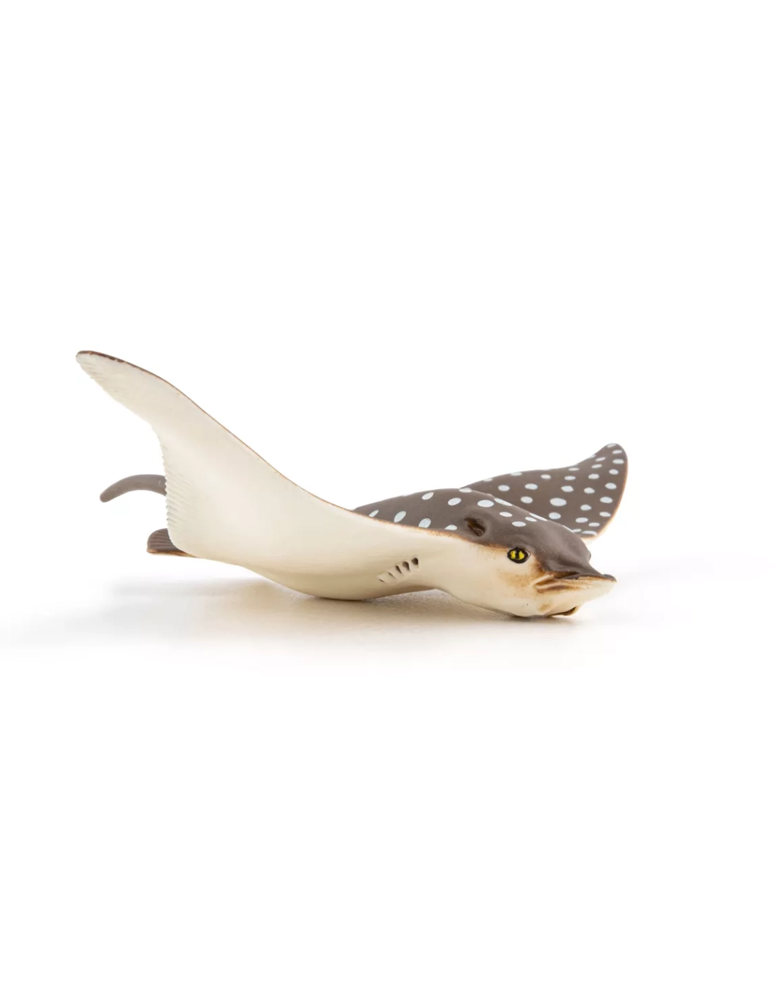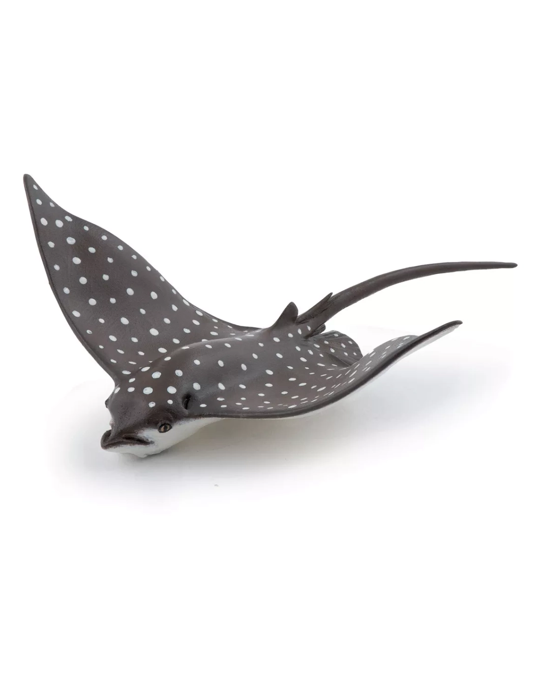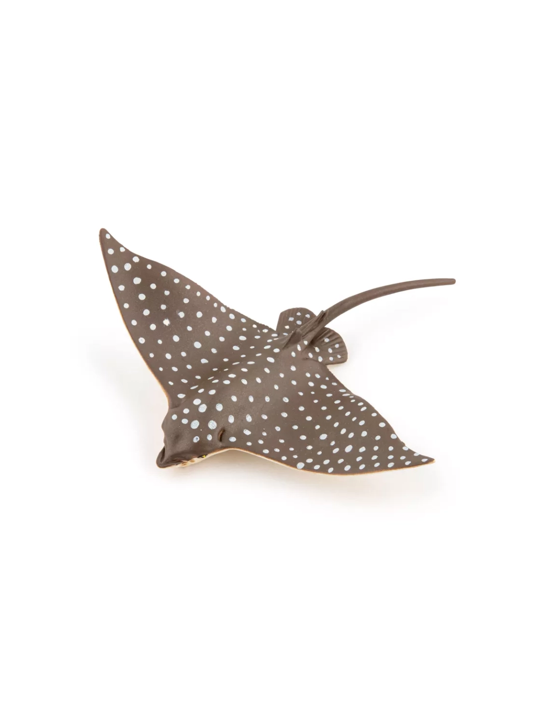 La raie léopard (Himantura leoparda) est un chondrichtyen benthique spectaculaire reconnaissable à sa livrée gris-bleu ponctuée de taches blanches évoquant la robe du félin éponyme. Ce batoidé de grande taille colonise les fonds sableux et vaseux des eaux tropicales indo-pacifiques où son camouflage parfait le rend quasiment invisible. Armement défensif redoutable : sa queue effilée porte 1 à 6 épines venimeuses rétro-dentelées à sa base, capable d'infliger des blessures douloureuses voire mortelles aux prédateurs imprudents. Le venin neurotoxique provoque nécroses tissulaires et paralysies respiratoires chez l'homme. Adaptation alimentaire spécialisée : ses mâchoires puissantes garnies de dents plates broyeuses pulvérisent efficacement coquillages, crustacés et mollusques enfouis qu'elle détecte par électroréception. Technique de chasse par enfouissement : dissimulée sous une fine couche sédimentaire, seuls ses yeux et spiracles dépassent pour surveiller le passage des proies. Reproduction ovovivipare produisant 2-6 jeunes par portée après 6-12 mois de gestation.Figurine Papo peinte à la main