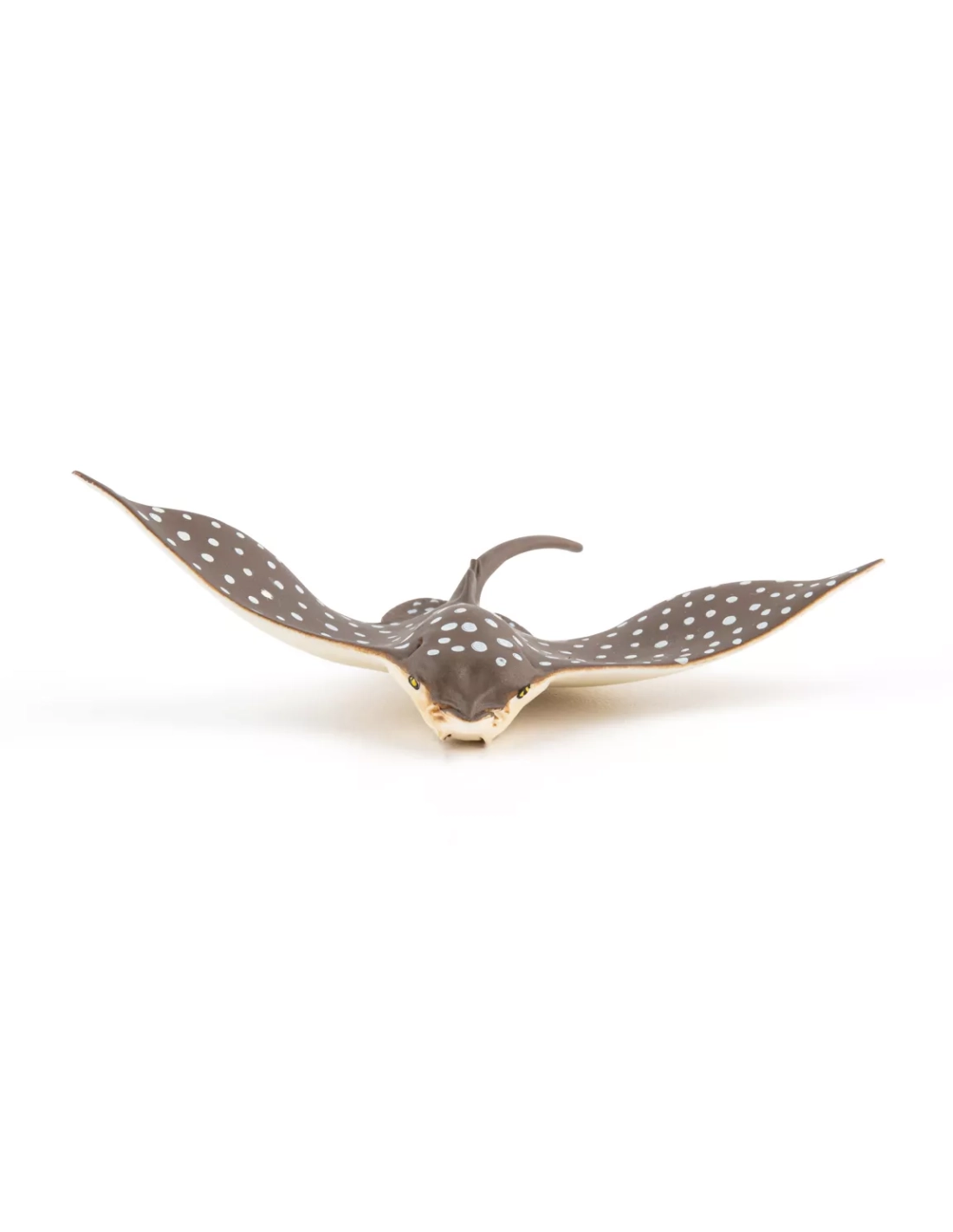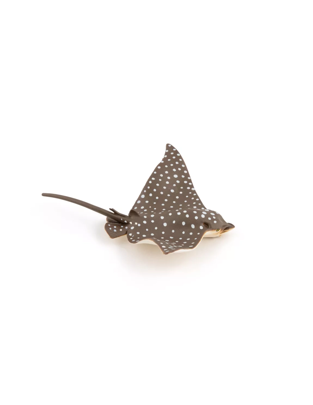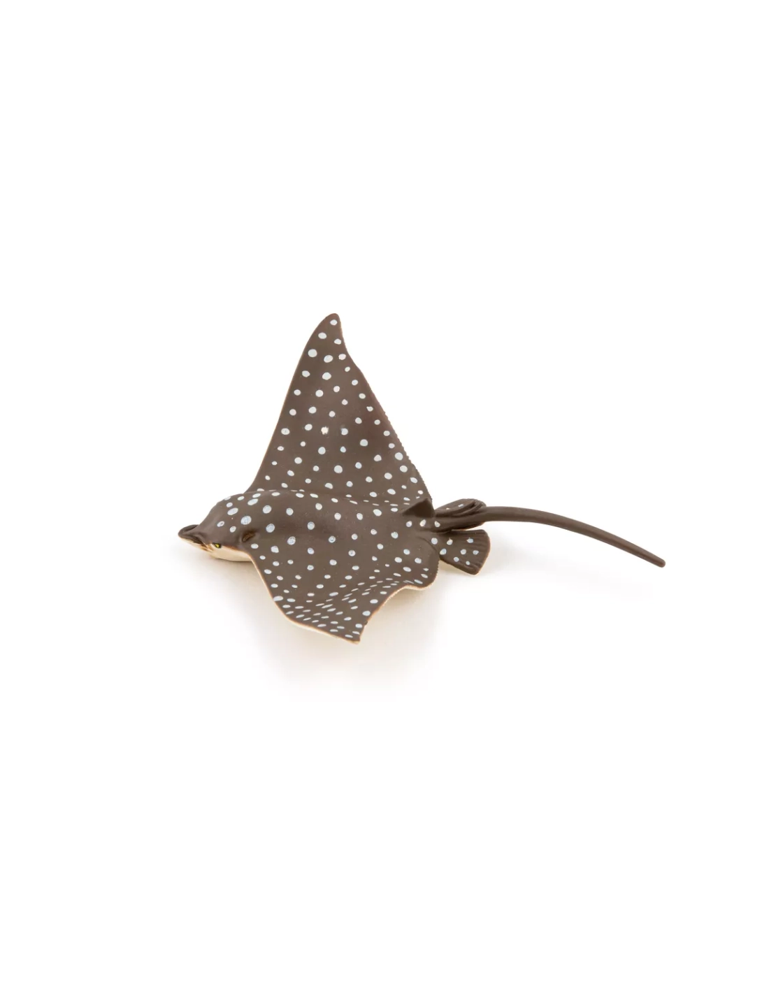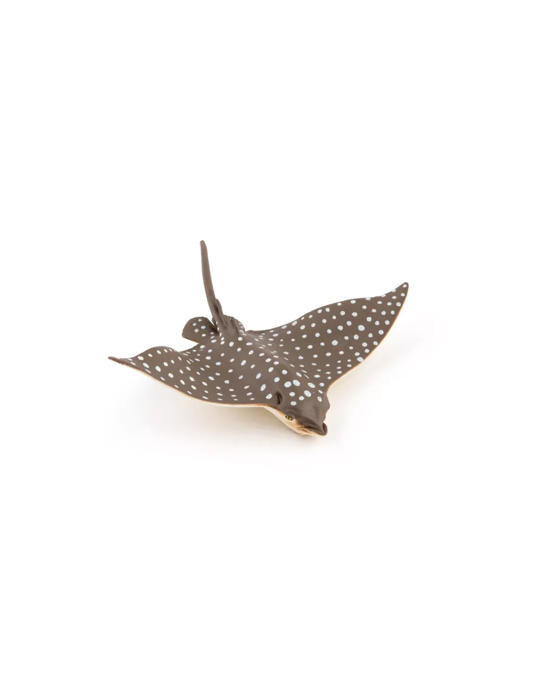 La raie léopard (Himantura leoparda) est un chondrichtyen benthique spectaculaire reconnaissable à sa livrée gris-bleu ponctuée de taches blanches évoquant la robe du félin éponyme. Ce batoidé de grande taille colonise les fonds sableux et vaseux des eaux tropicales indo-pacifiques où son camouflage parfait le rend quasiment invisible. Armement défensif redoutable : sa queue effilée porte 1 à 6 épines venimeuses rétro-dentelées à sa base, capable d'infliger des blessures douloureuses voire mortelles aux prédateurs imprudents. Le venin neurotoxique provoque nécroses tissulaires et paralysies respiratoires chez l'homme. Adaptation alimentaire spécialisée : ses mâchoires puissantes garnies de dents plates broyeuses pulvérisent efficacement coquillages, crustacés et mollusques enfouis qu'elle détecte par électroréception. Technique de chasse par enfouissement : dissimulée sous une fine couche sédimentaire, seuls ses yeux et spiracles dépassent pour surveiller le passage des proies. Reproduction ovovivipare produisant 2-6 jeunes par portée après 6-12 mois de gestation.Figurine Papo peinte à la main