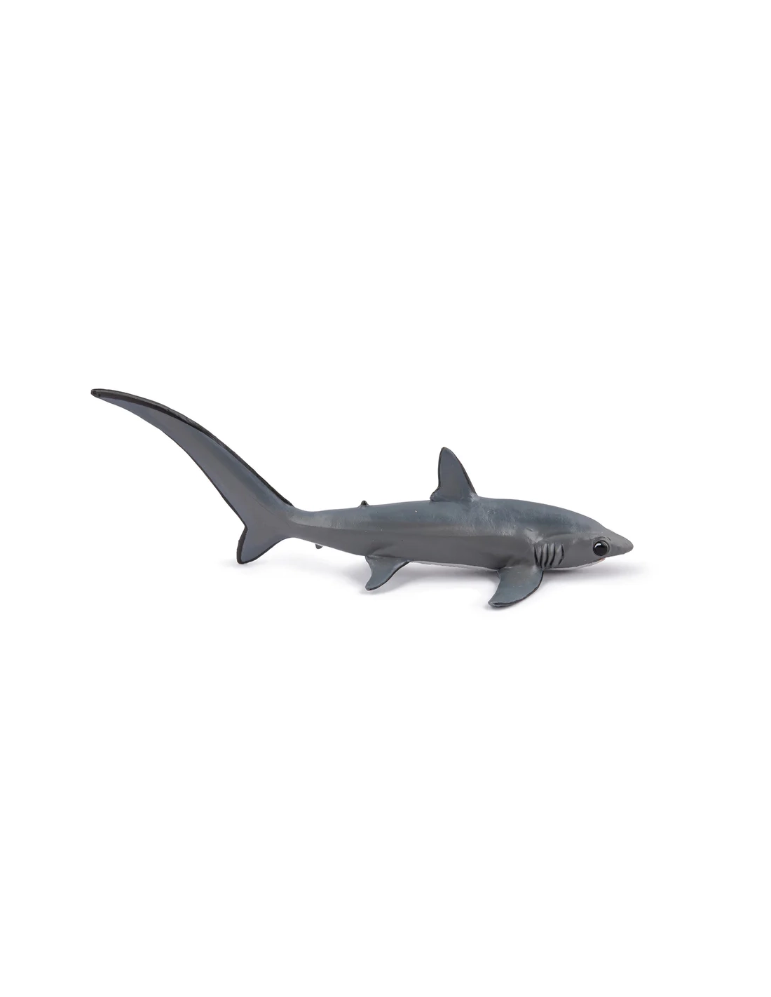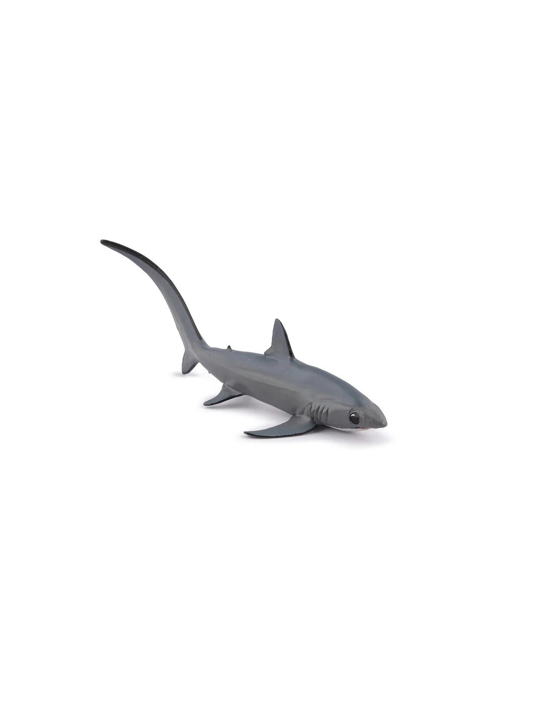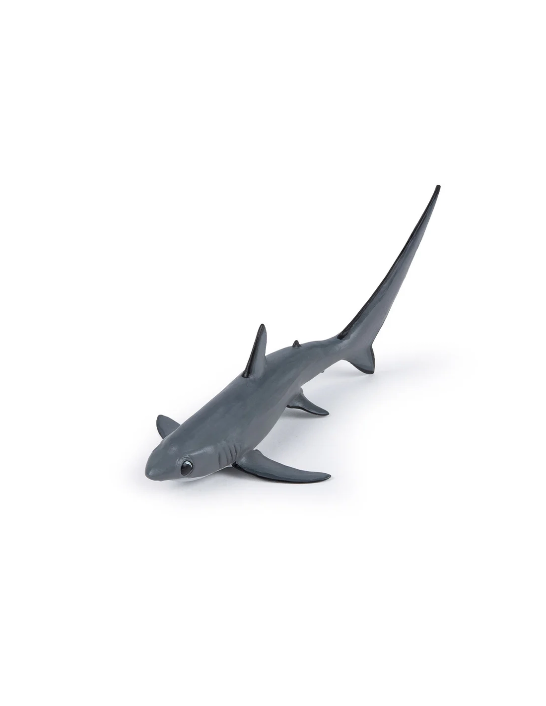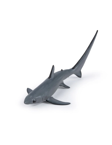 Impossible de le confondre avec un autre requin : la nageoire caudale du requin renard est aussi longue que son corps entier. Ce grand prédateur pélagique, aussi appelé renard de mer, se distingue autant par sa silhouette spectaculaire que par sa technique de chasse unique en son genre. La figurine Papo de la collection L'Univers Marin en restitue fidèlement la forme allongée, le dos gris ardoise et cette queue démesurée qui fait toute son identité.