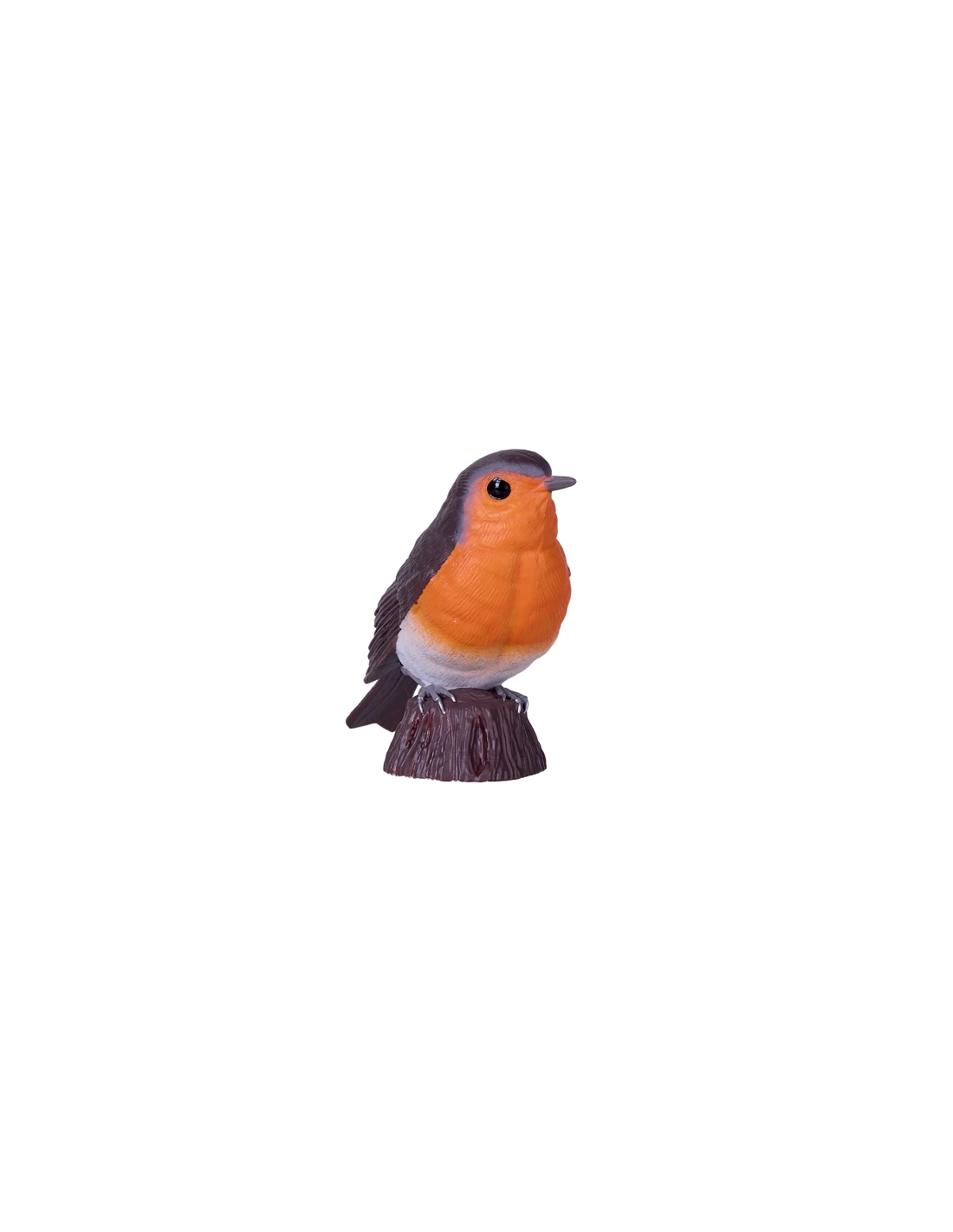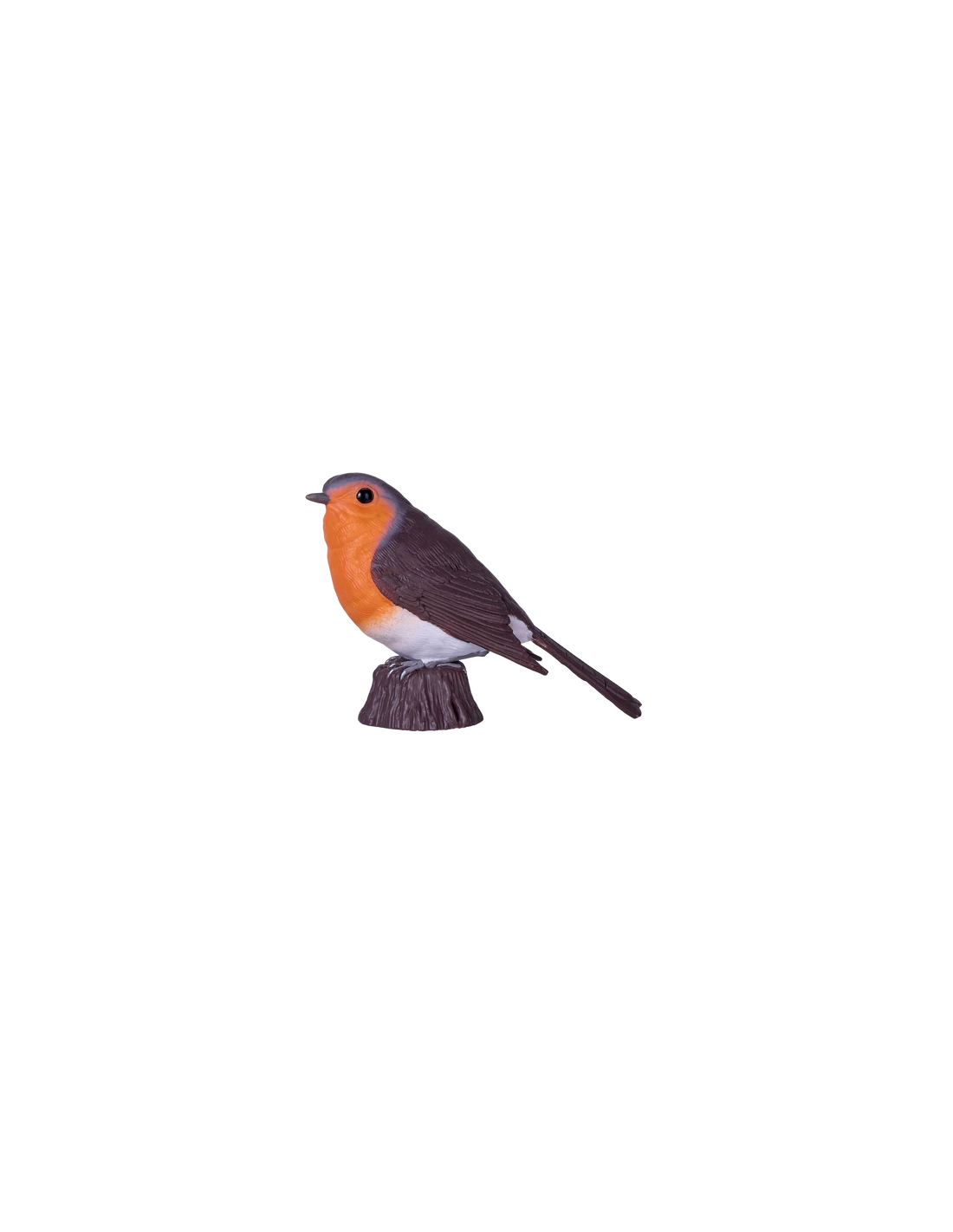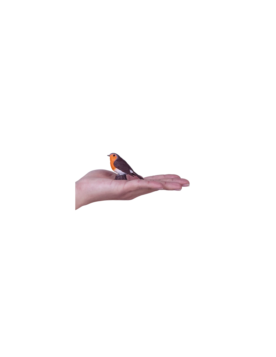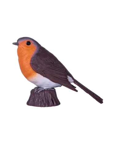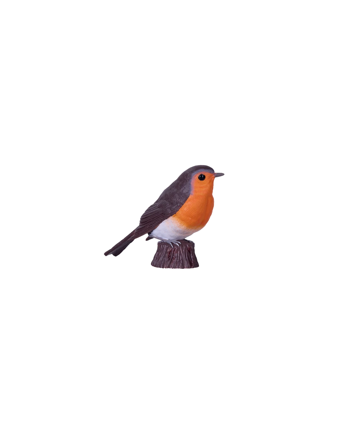 Cette figurine Papo représente un rouge-gorge, un petit oiseau familier des jardins. Sa poitrine rouge orangée et son plumage brun clair permettent de l’identifier au premier regard. Sa posture attentive évoque l’oiseau posé sur une branche, observant son environnement.