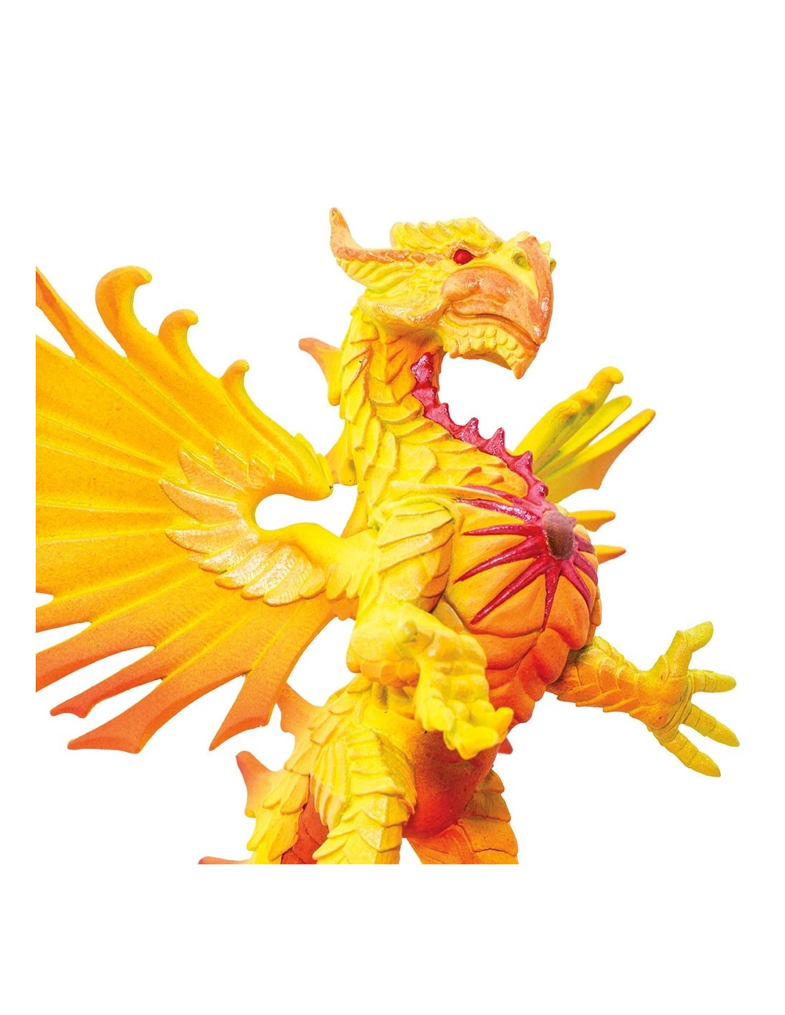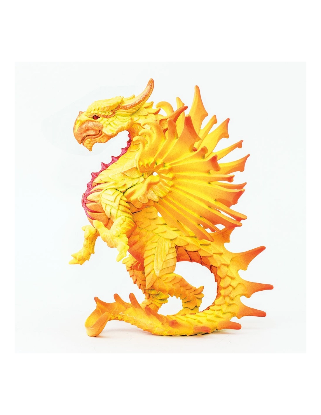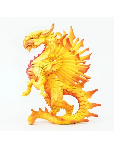 - Couleurs : Solarius arbore des couleurs vibrantes de jaune éclatant avec des touches de rouge et d'orange, évoquant les flammes ardentes du soleil. Ses ailes spectaculaires et ses détails soigneusement sculptés le rendent unique parmi les dragons.