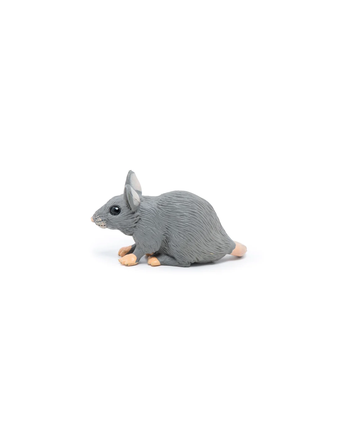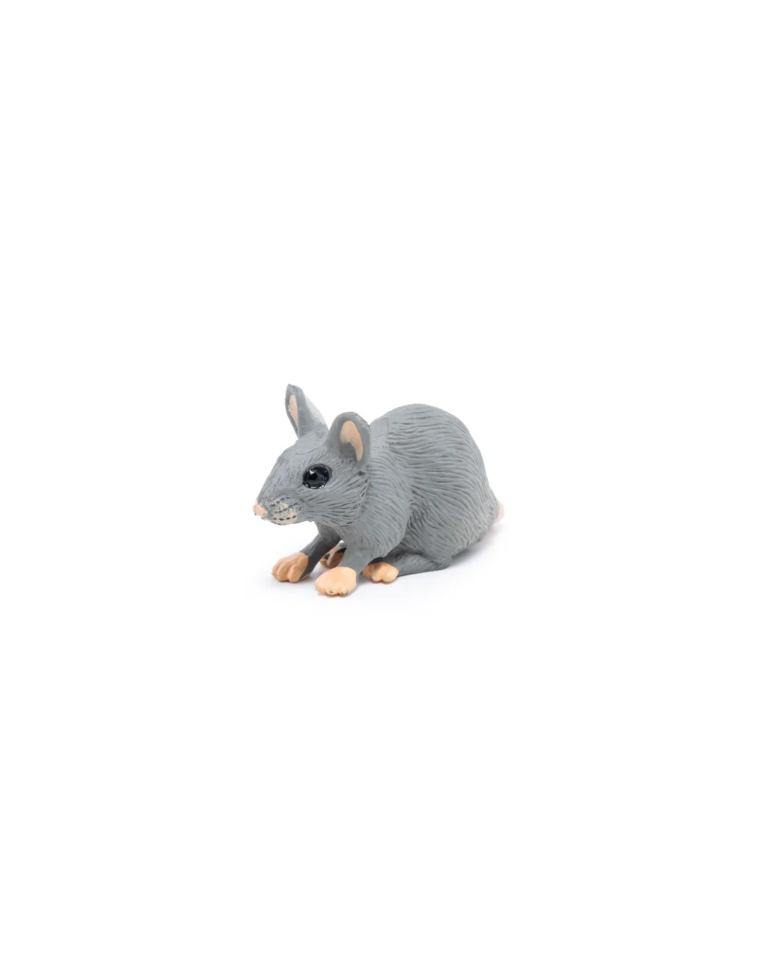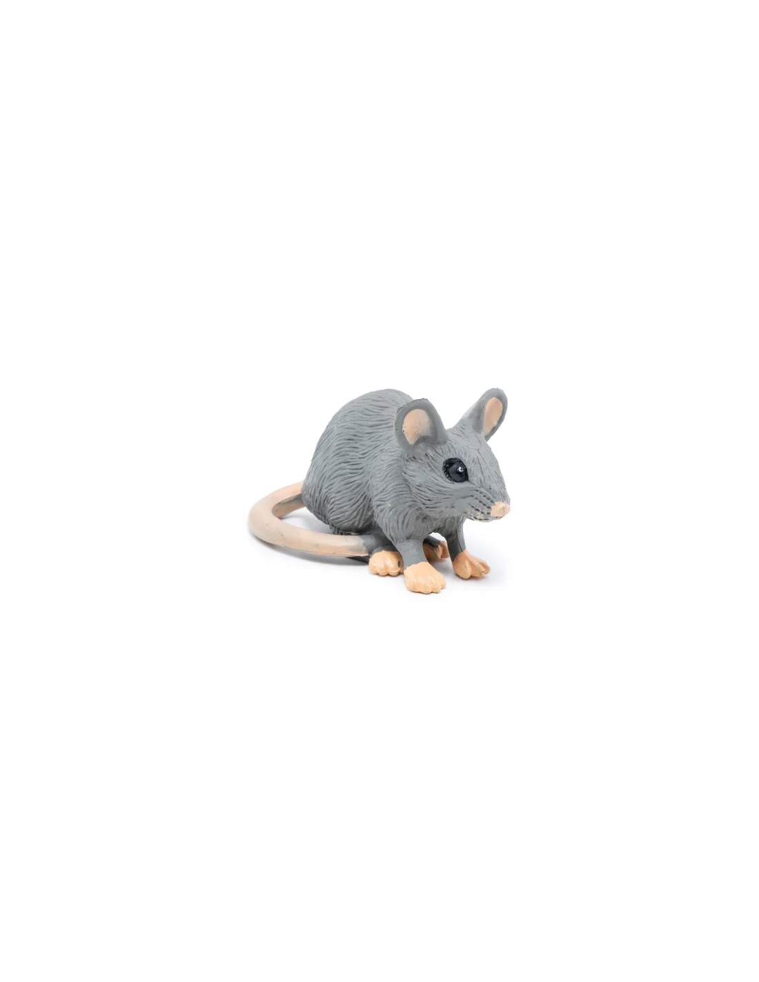 La souris est sculptée avec un pelage fin, de grands yeux sombres et une queue mince posée derrière elle. Sa posture basse permet d’imaginer une scène d’exploration ou de nourriture, comme lorsque les souris fouillent le sol à la recherche de graines. Sa simplicité en fait une figurine facile à intégrer dans un mini-monde de jardin, une scène de grange ou une activité de découverte des animaux du quotidien.