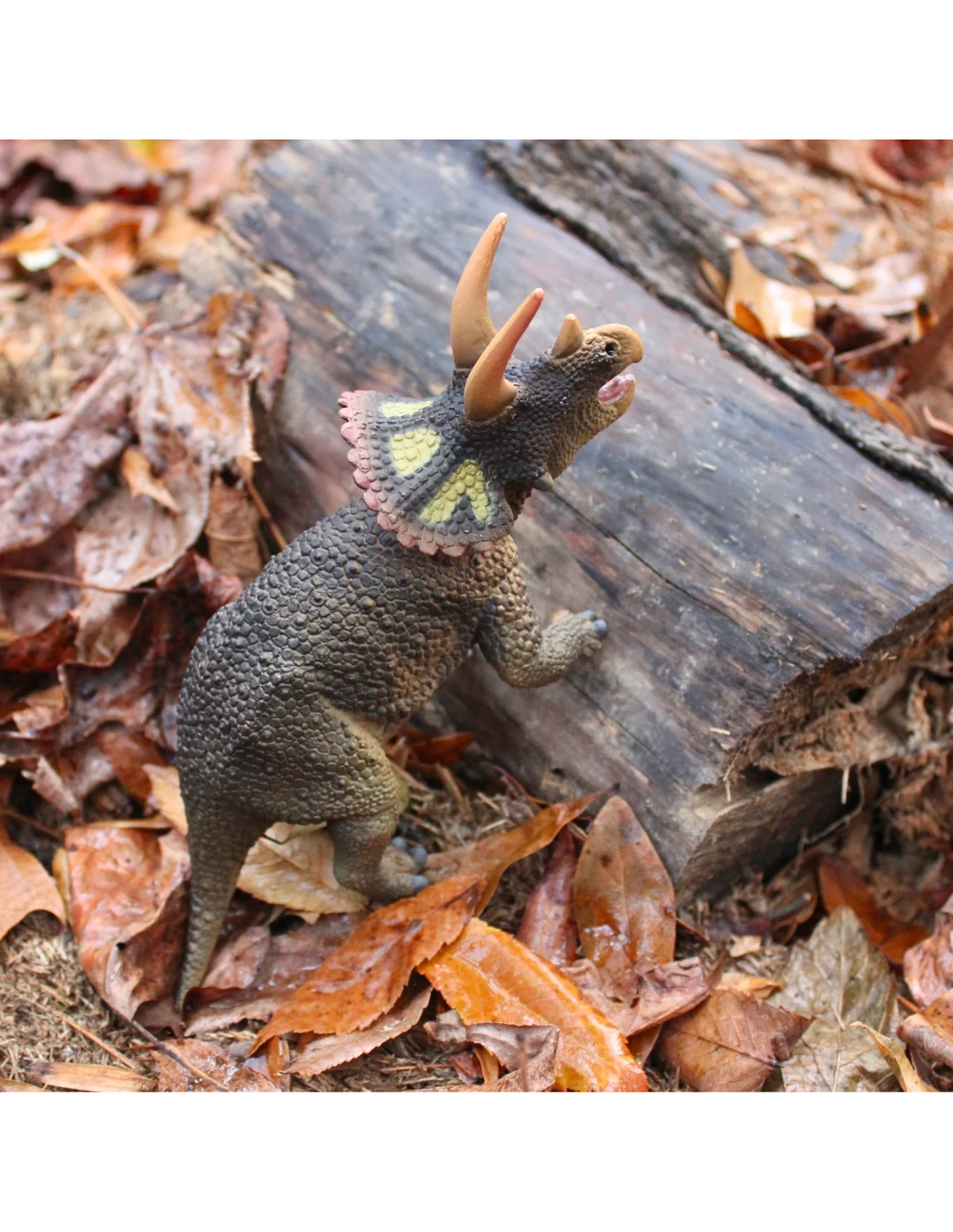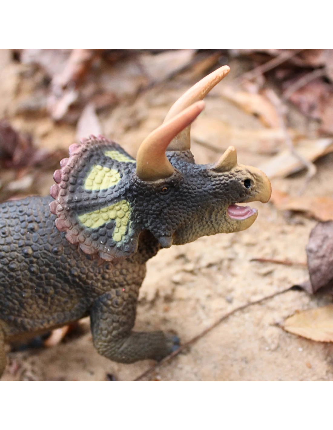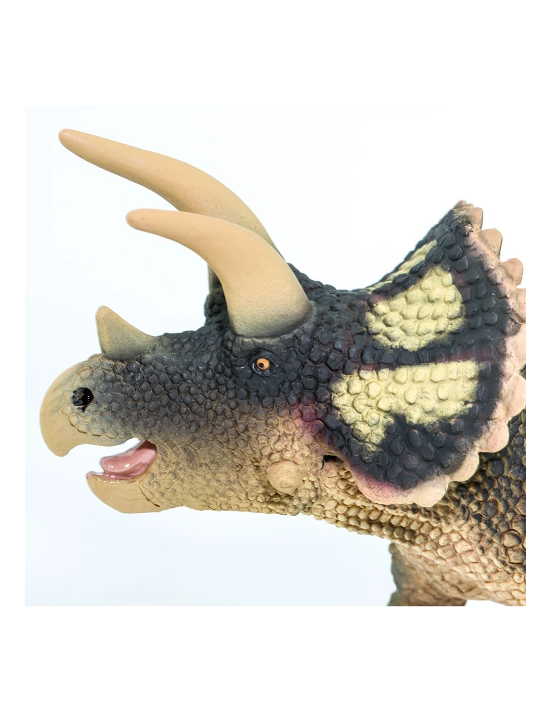 Sur cette figurine Safari Ltd, les trois cornes sont sculptées avec précision, respectant les proportions caractéristiques de ce dinosaure emblématique.