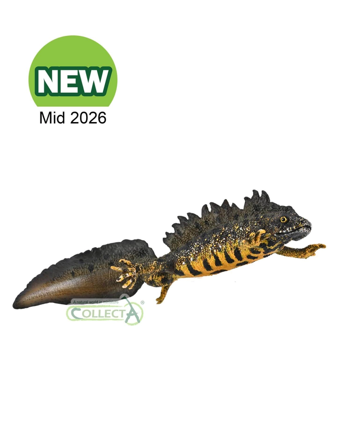 Dos noir charbon, ventre orange vif zébré de taches noires, crête dorsale dentelée comme une scie : le triton crêté en livrée nuptiale est l'amphibien le plus spectaculaire de nos étangs et mares européens. Figurine CollectA qui représente un mâle en pleine période de reproduction, en nage, à l'échelle des « Little Wonders ».