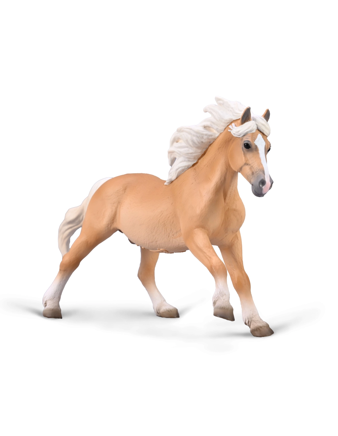 Cette reproduction respecte scrupuleusement les critères du stud-book Haflinger : la robe alezan obligatoire, les crins lavés caractéristiques, la morphologie harmonieuse et compacte. Chaque détail anatomique correspond aux exigences de la race, témoignant de siècles de sélection dans les Alpes autrichiennes.