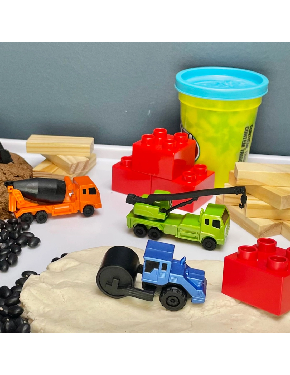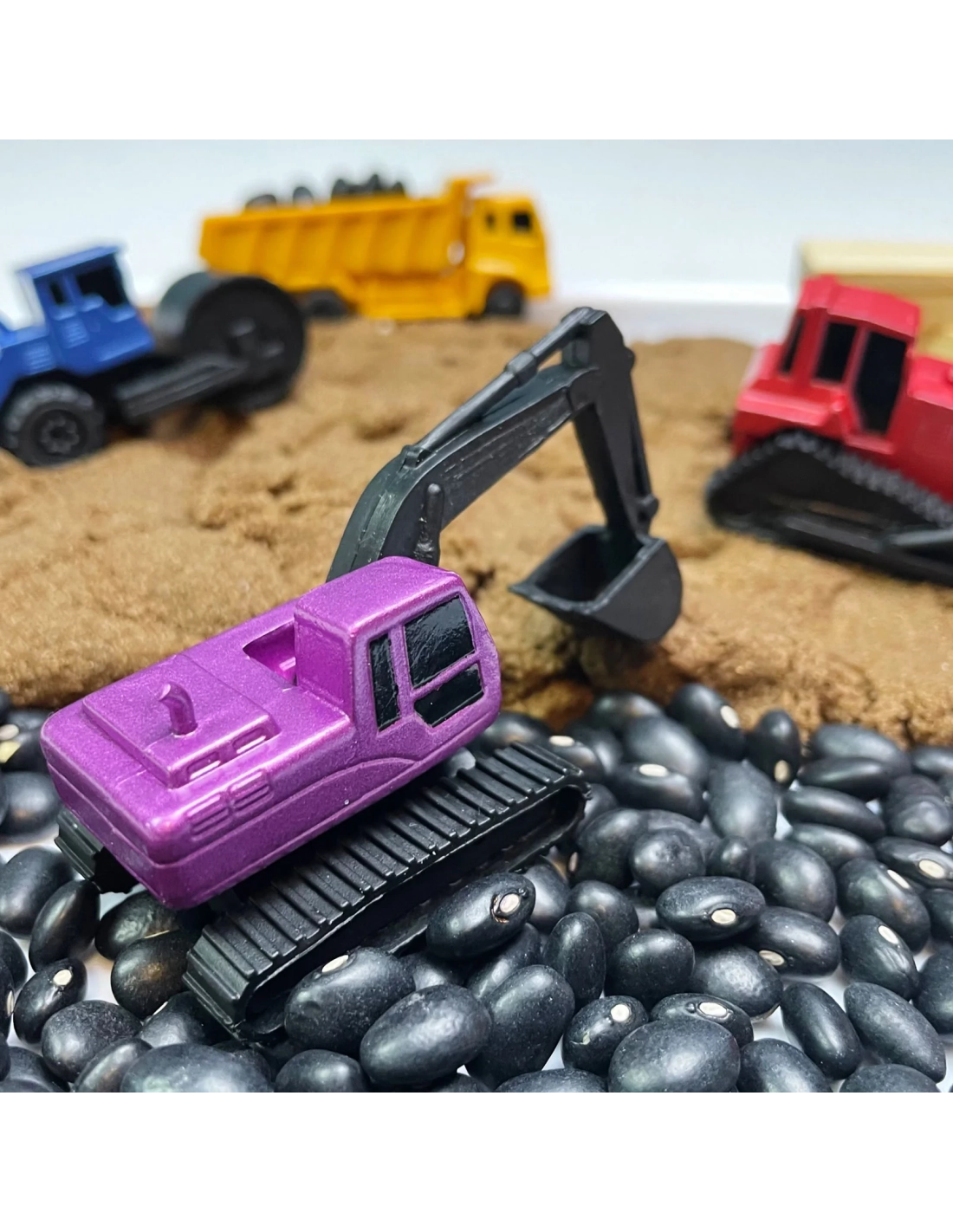 Transformez n'importe quel bac à sable ou bac sensoriel en mini-chantier avec cet ensemble de 6 véhicules de construction miniatures lumineux et colorés !