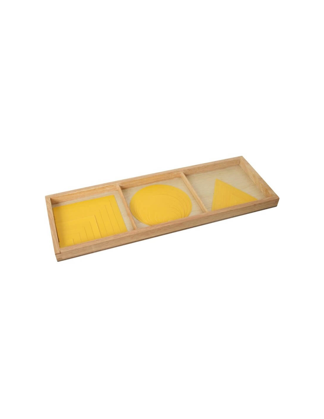 Ce Jeu de formes géométriques Montessori en bois (jaune) permet à l'enfant d'explorer et de manipuler les trois formes géométriques de base (cercle, triangle, carré), dans différentes tailles et avec une approche sensorielle. Il est composé de 10 carrés, 10 triangles et 10 cercles en bois, tous peints en jaune, et variant de 1 cm à 10 cm. Ces formes sont proposées dans une boîte de rangement en bois avec 3 compartiments, afin d'apprendre à trier et ranger le matériel.